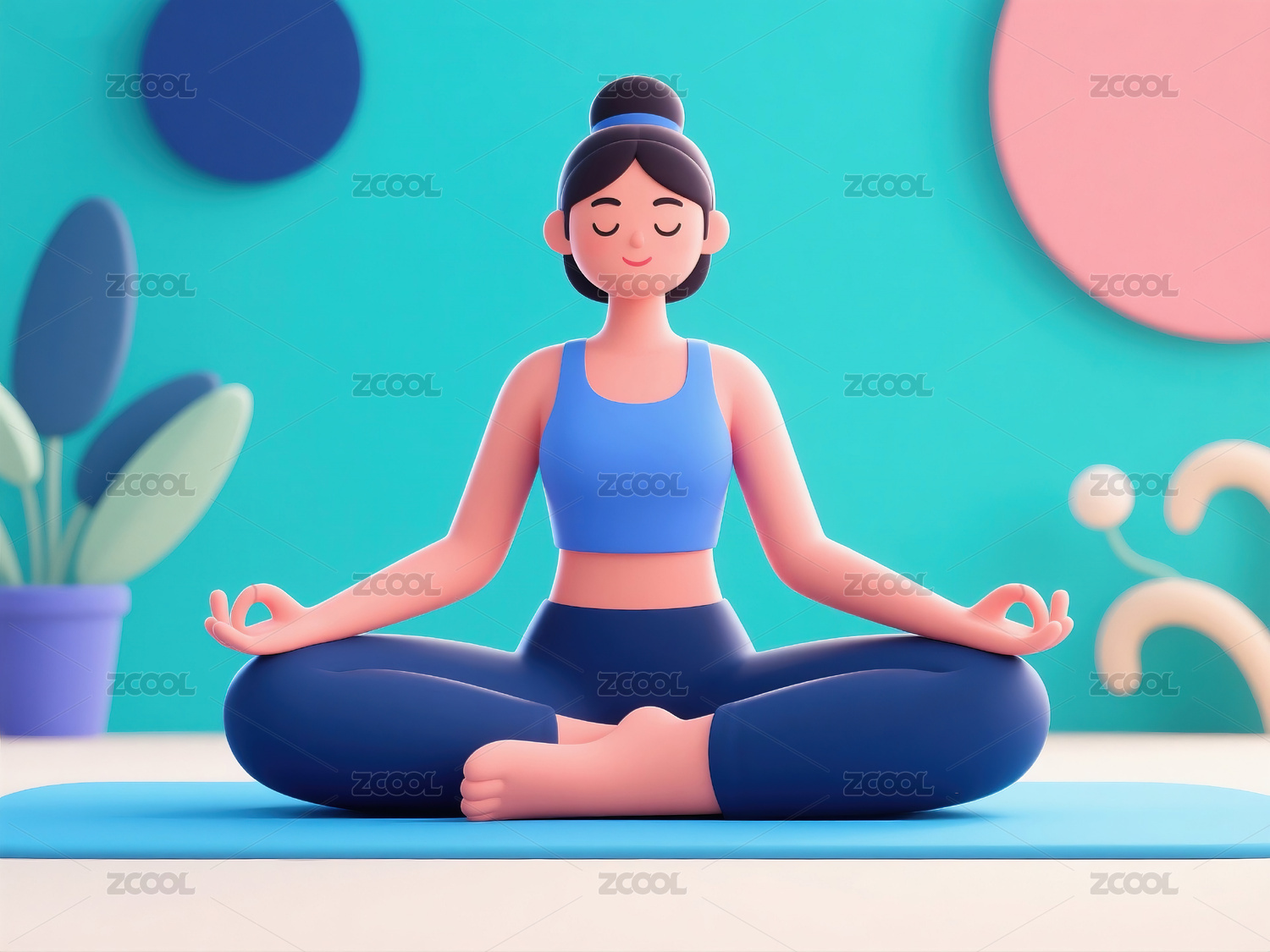 美丽时尚的年轻单身女孩在健身房室内练瑜伽锻炼身体,一边开着智能空调感受科技带来的乐趣插画背景海报