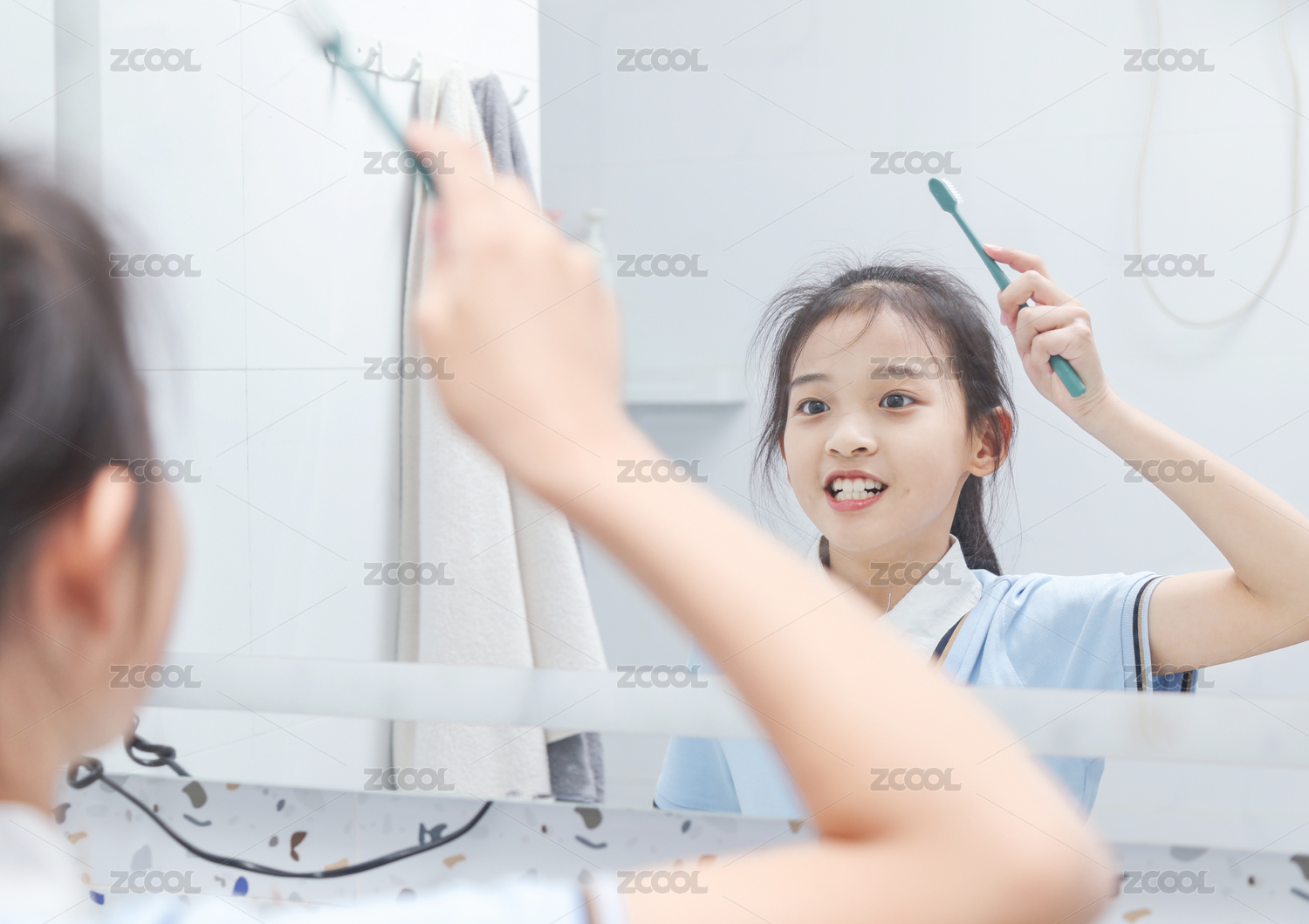 卫生间,镜子,小,女孩,学生,湿巾,洗手,洗脸,洁面,打扮