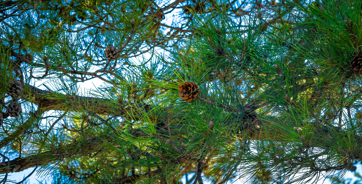 蓝天下松果的低角度视图