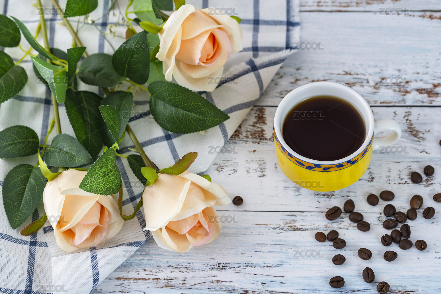 木纹桌面上垫着格子桌布的粉色玫瑰花和咖啡
