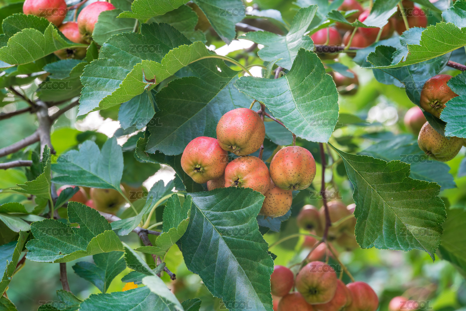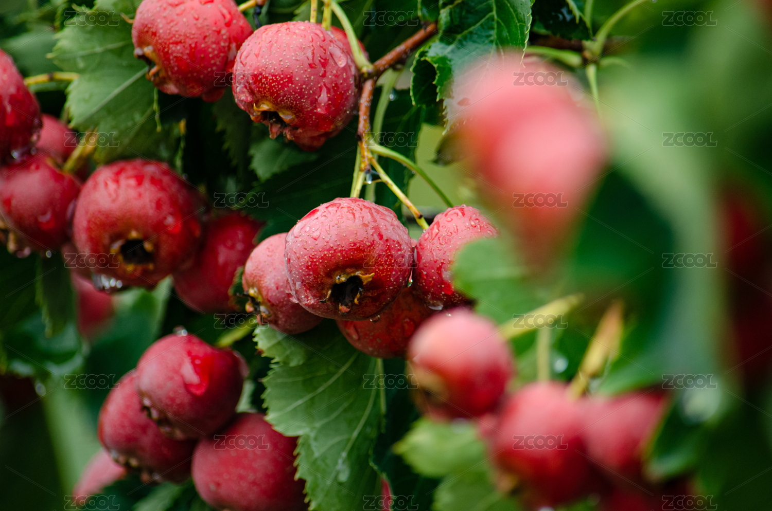 下雨天气山楂树上结出红色的山楂果实和水珠