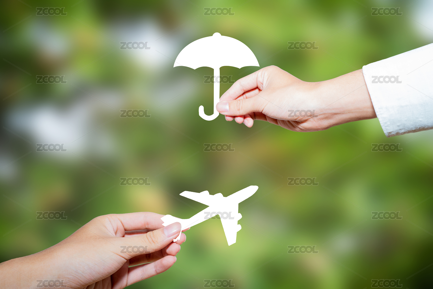 一个人手拿着雨伞另一个人手拿着剪纸保险保障平安概念