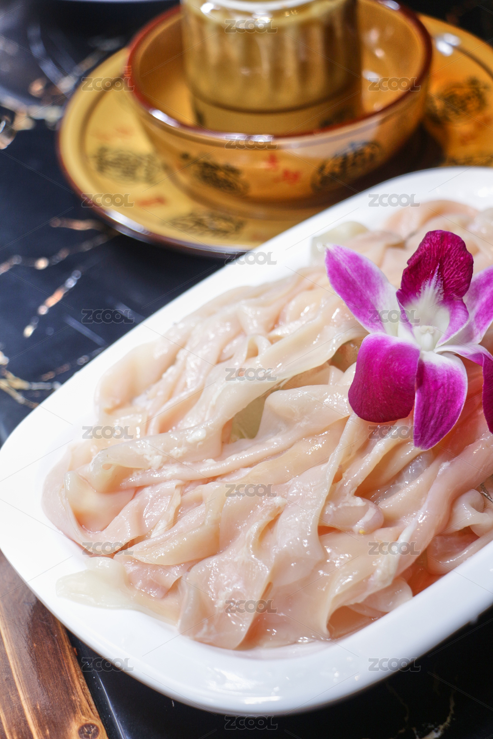 一盘四川火锅菜品鹅肠摆盘放桌子上