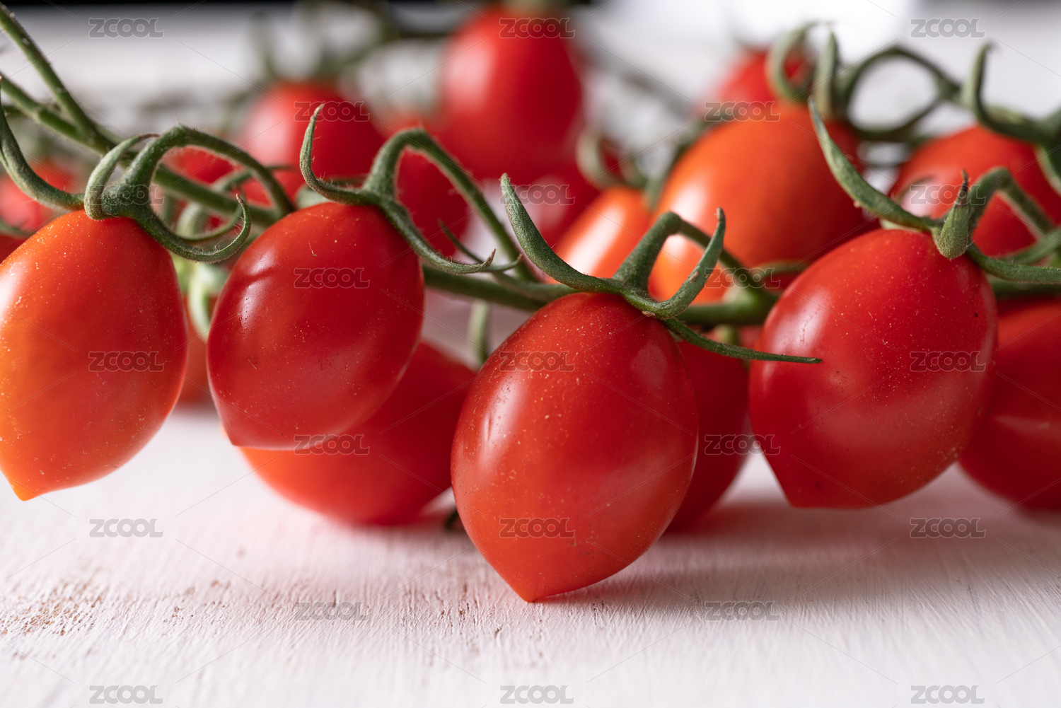在白色桌面上散落着几串新采摘的小番茄