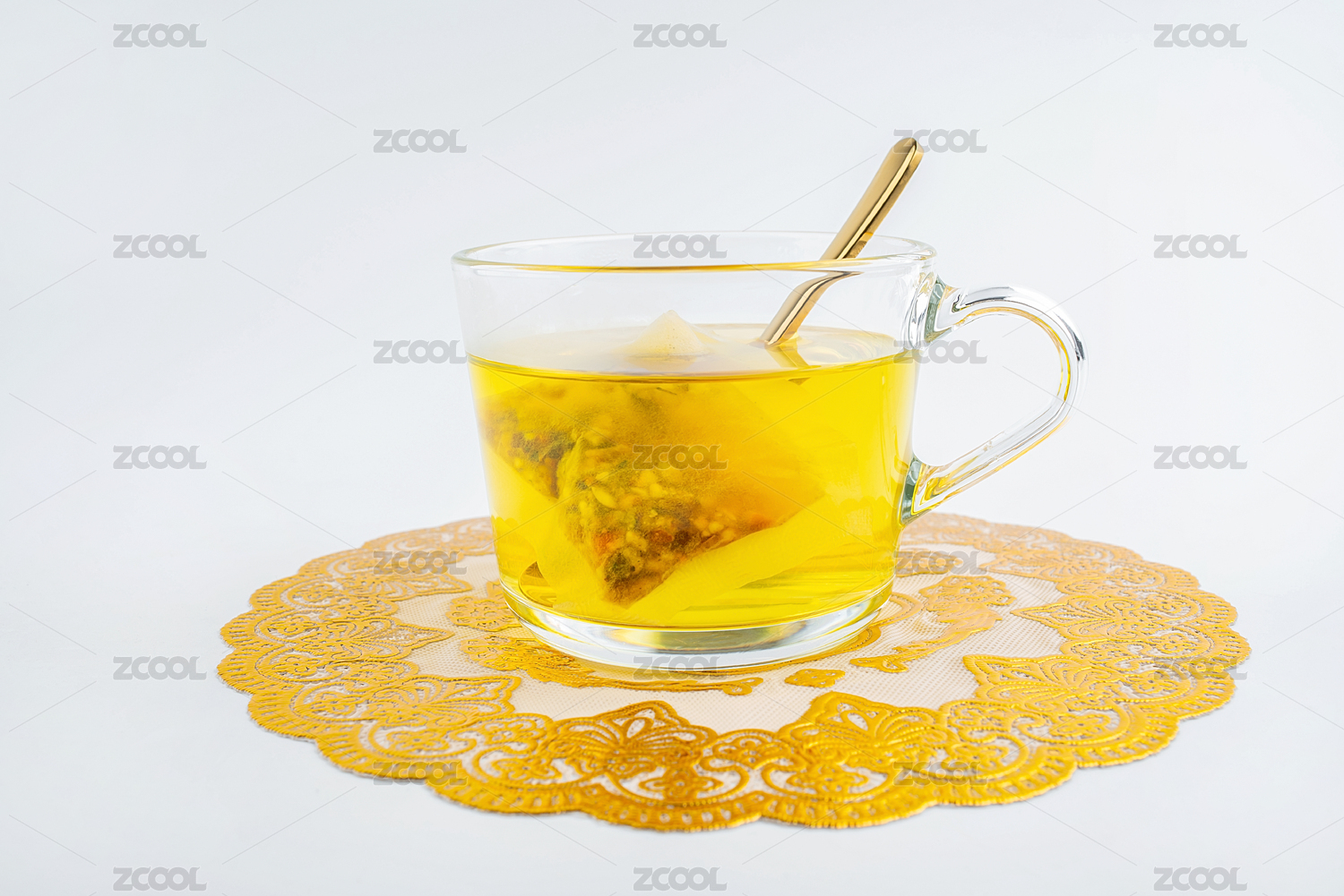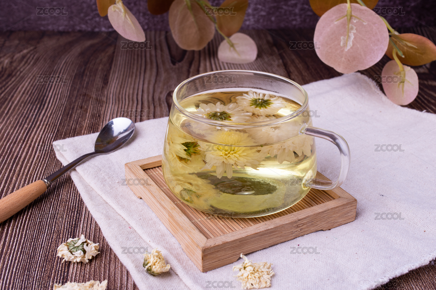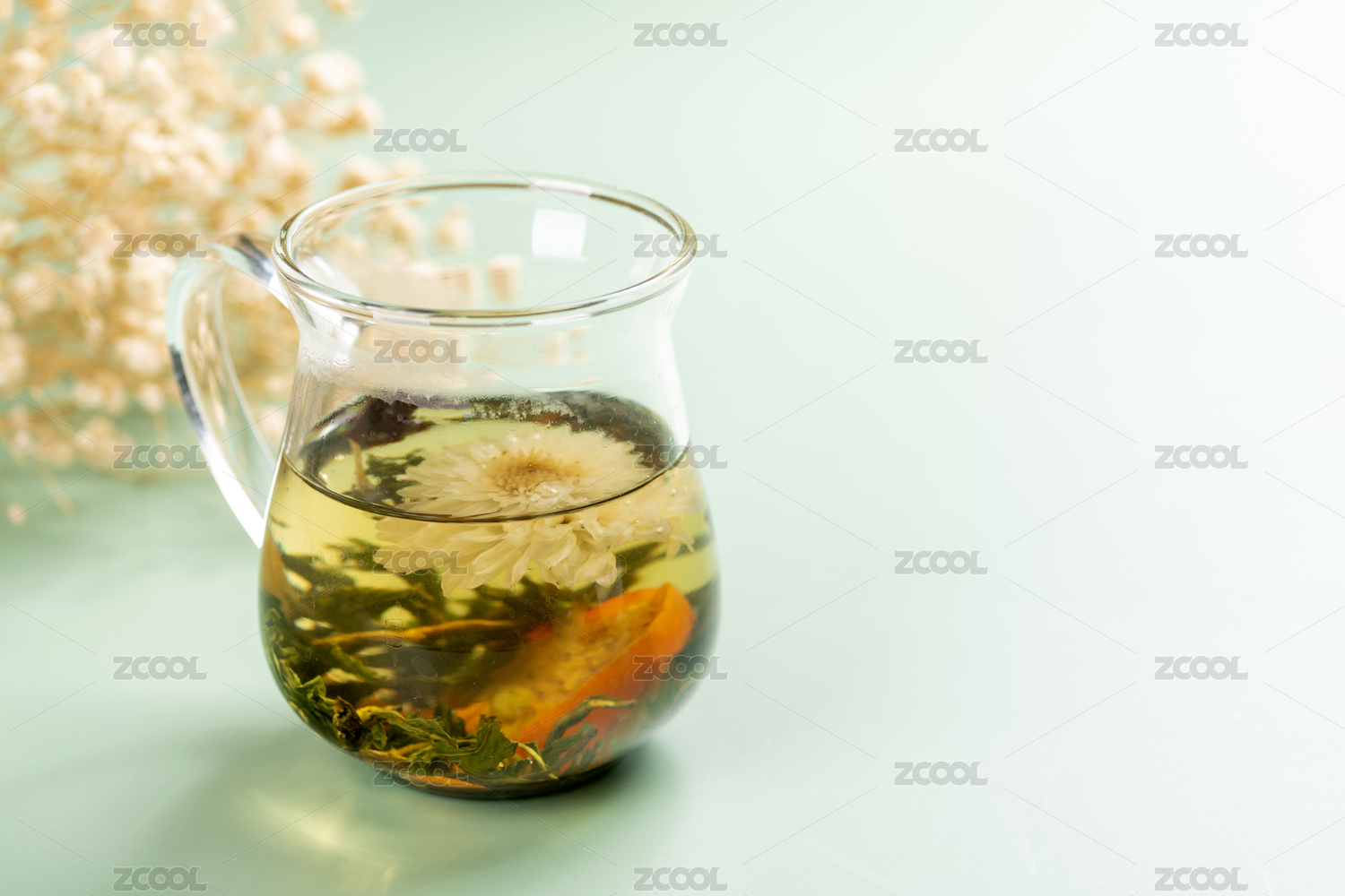 桌面上的白色面部上的玻璃杯子里的菊花茶