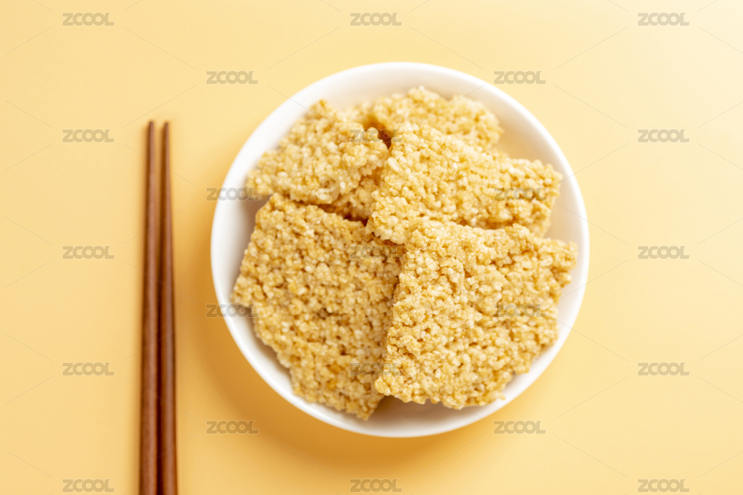 糯米锅巴,糯米,锅巴,一盘,筷子,橙汁,茶水,茶杯,茶壶,托盘