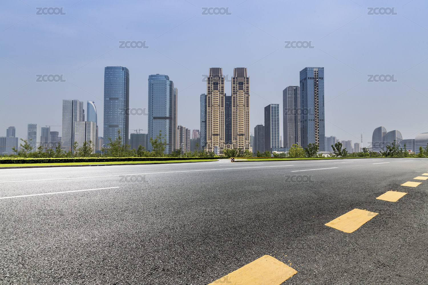 现代城市天际线与空旷路面