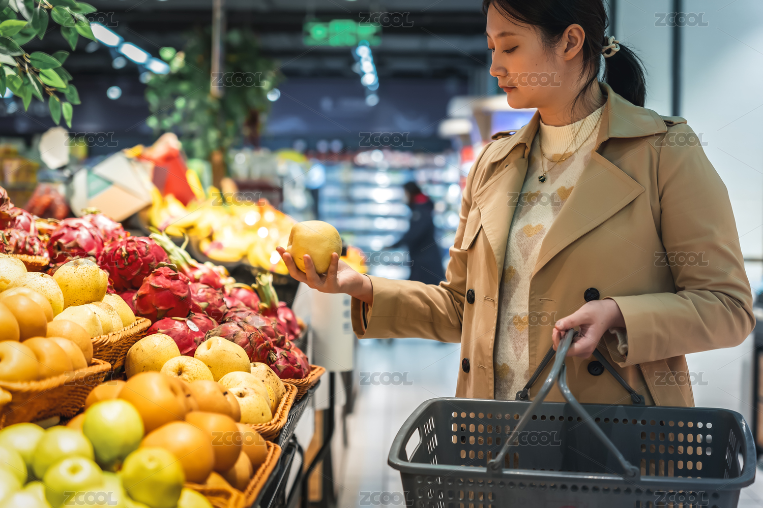 亚洲女孩在超市过道挑选新鲜的水果