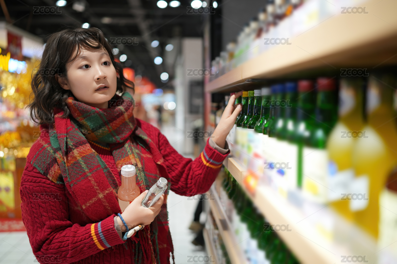 在多彩的零售环境中购买饮料的女性