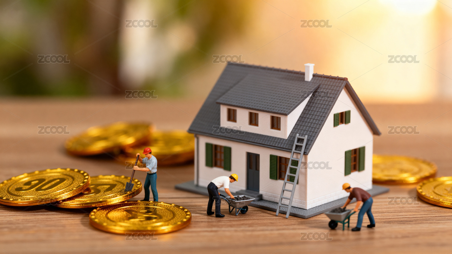 微型房屋模型与金币堆