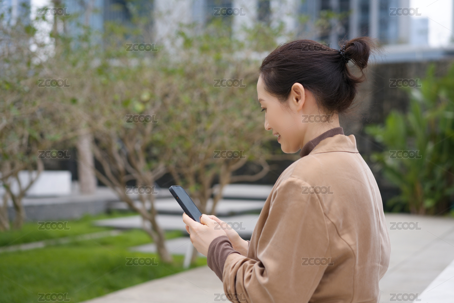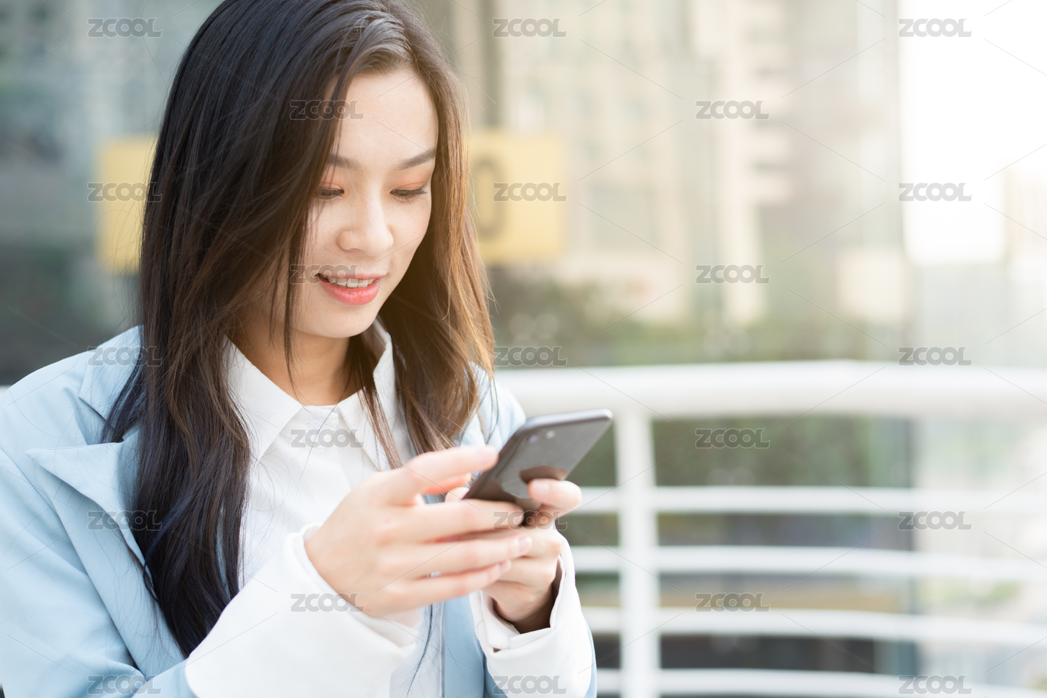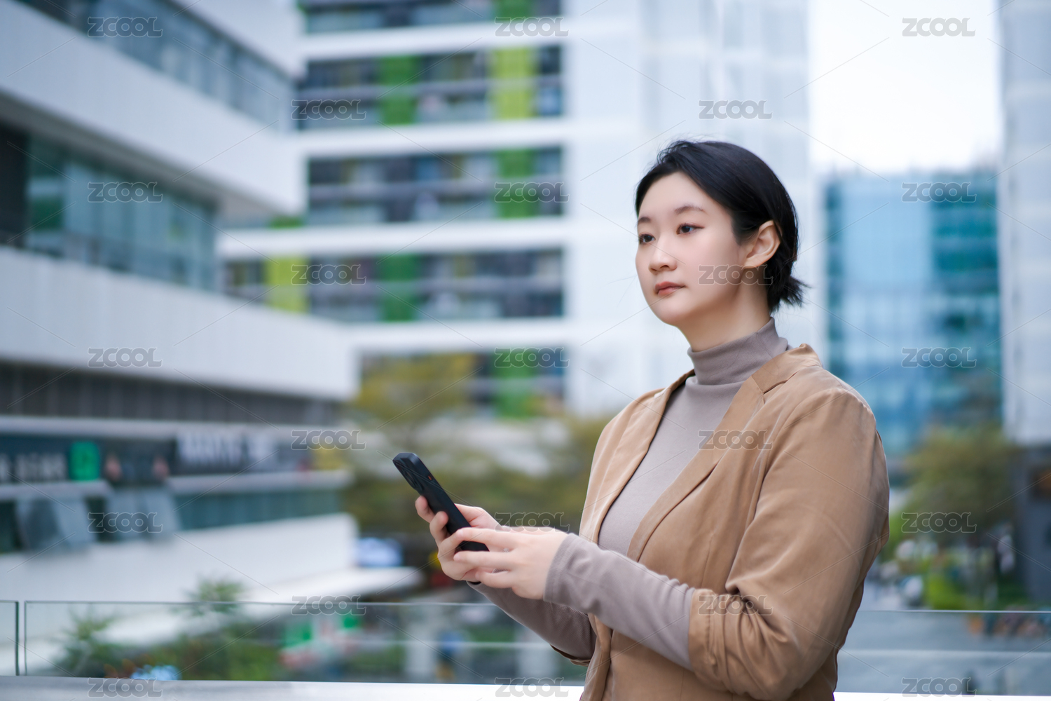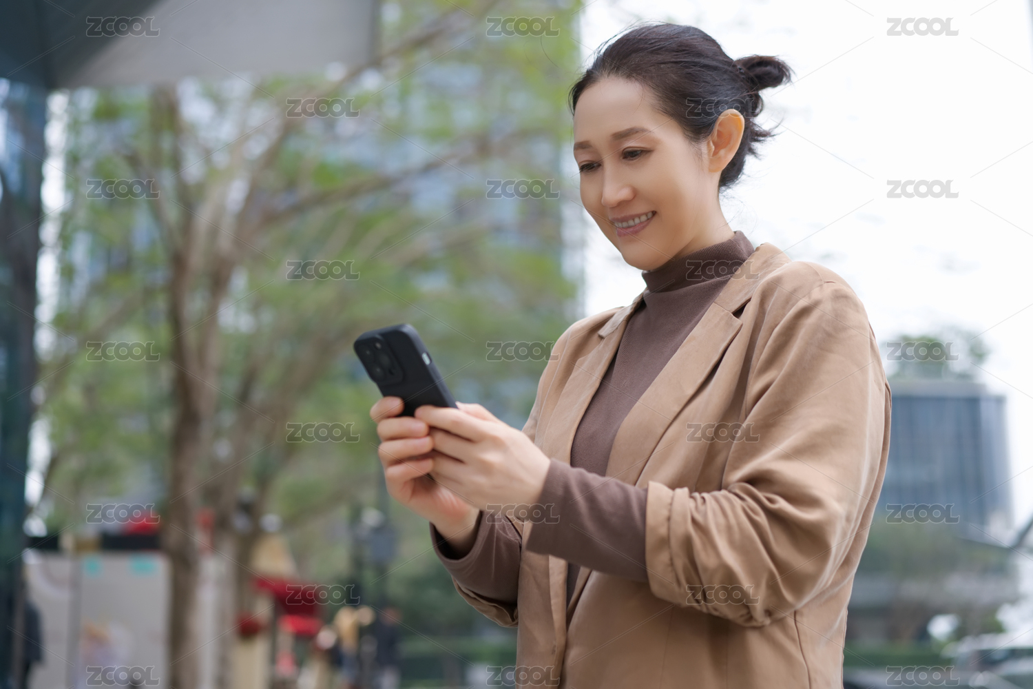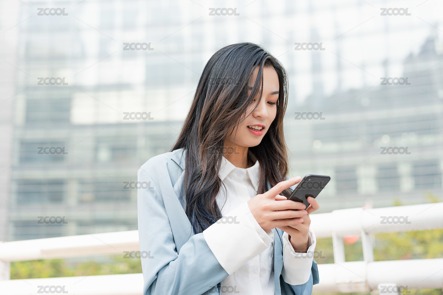 年轻商务女士在CBD使用手机