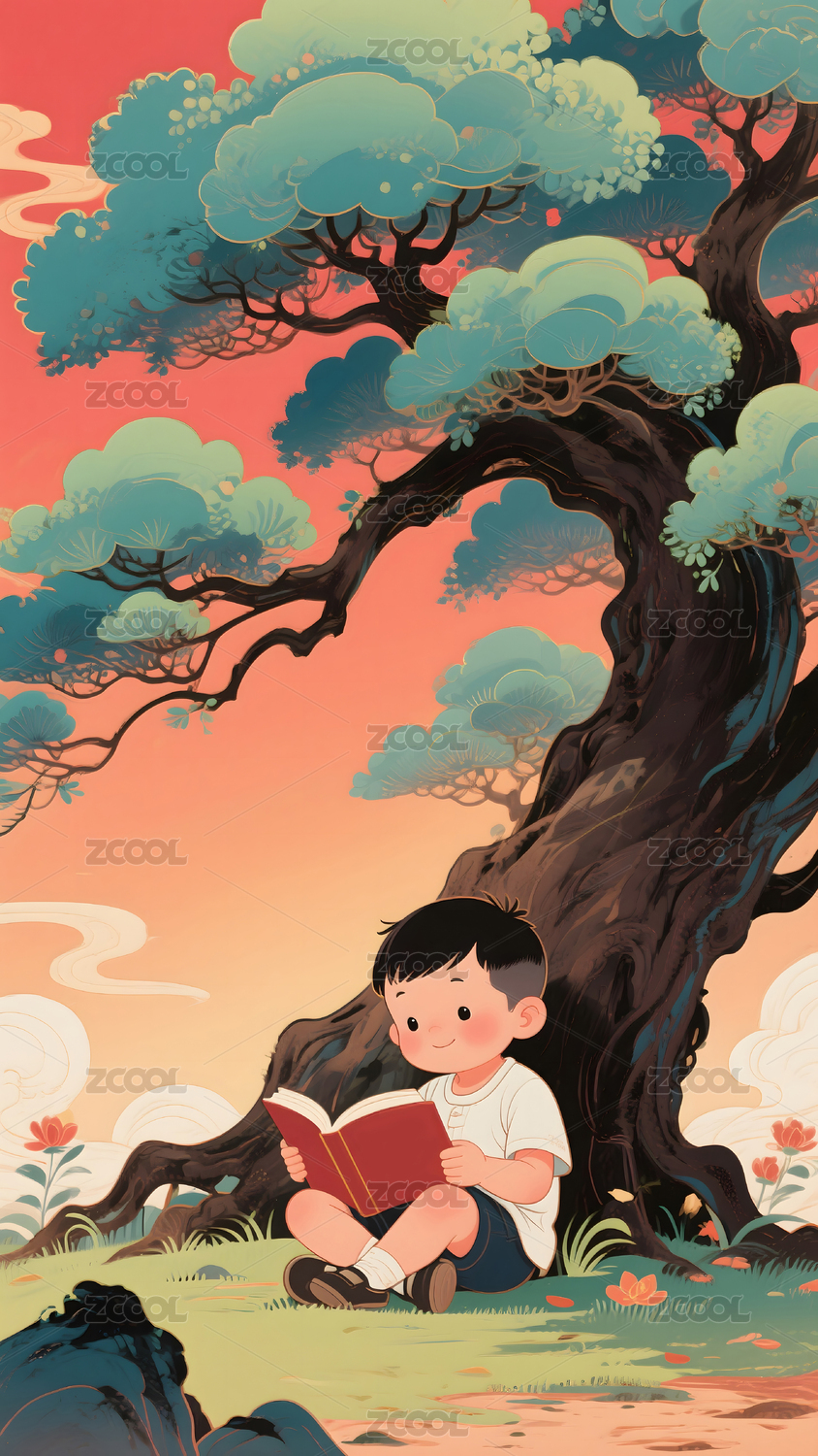 水墨风格芭蕉树下坐在石头上的男童读国学书插画人物元素