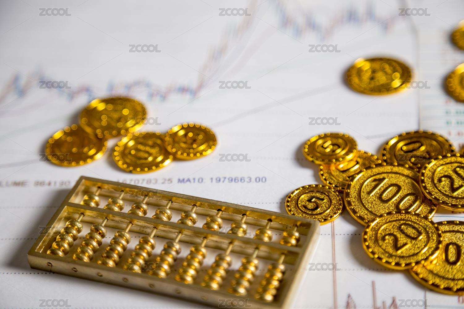 黄金金币与经济数据报表经济金融类静物特写