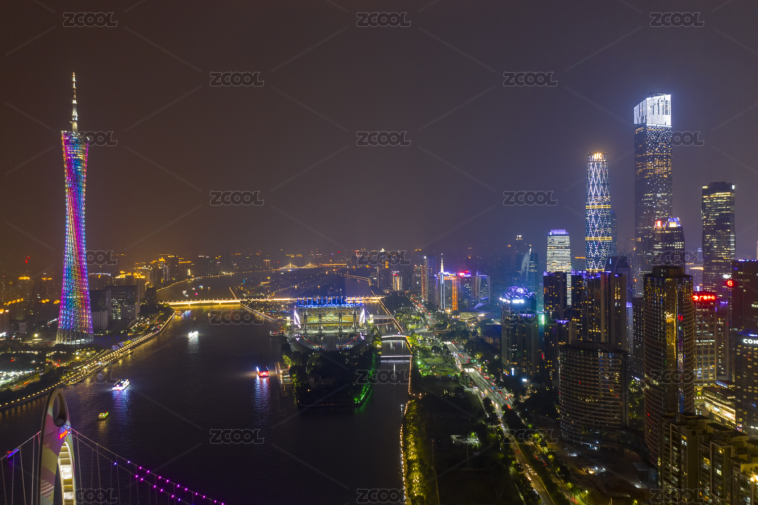 中国广州广州塔珠江新城夜景航拍图