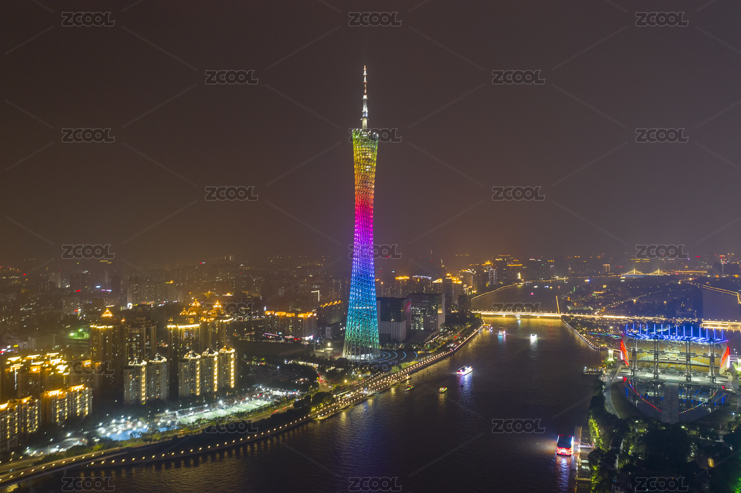 晚上亮起灯光的广州地标建筑广州塔