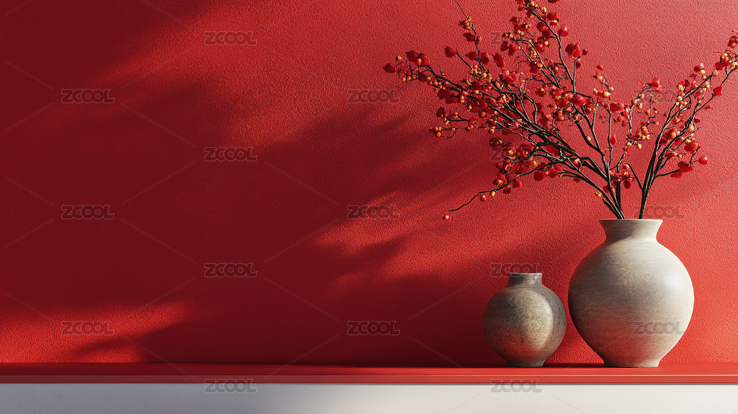 红底白花红果枝,红色花瓶插放