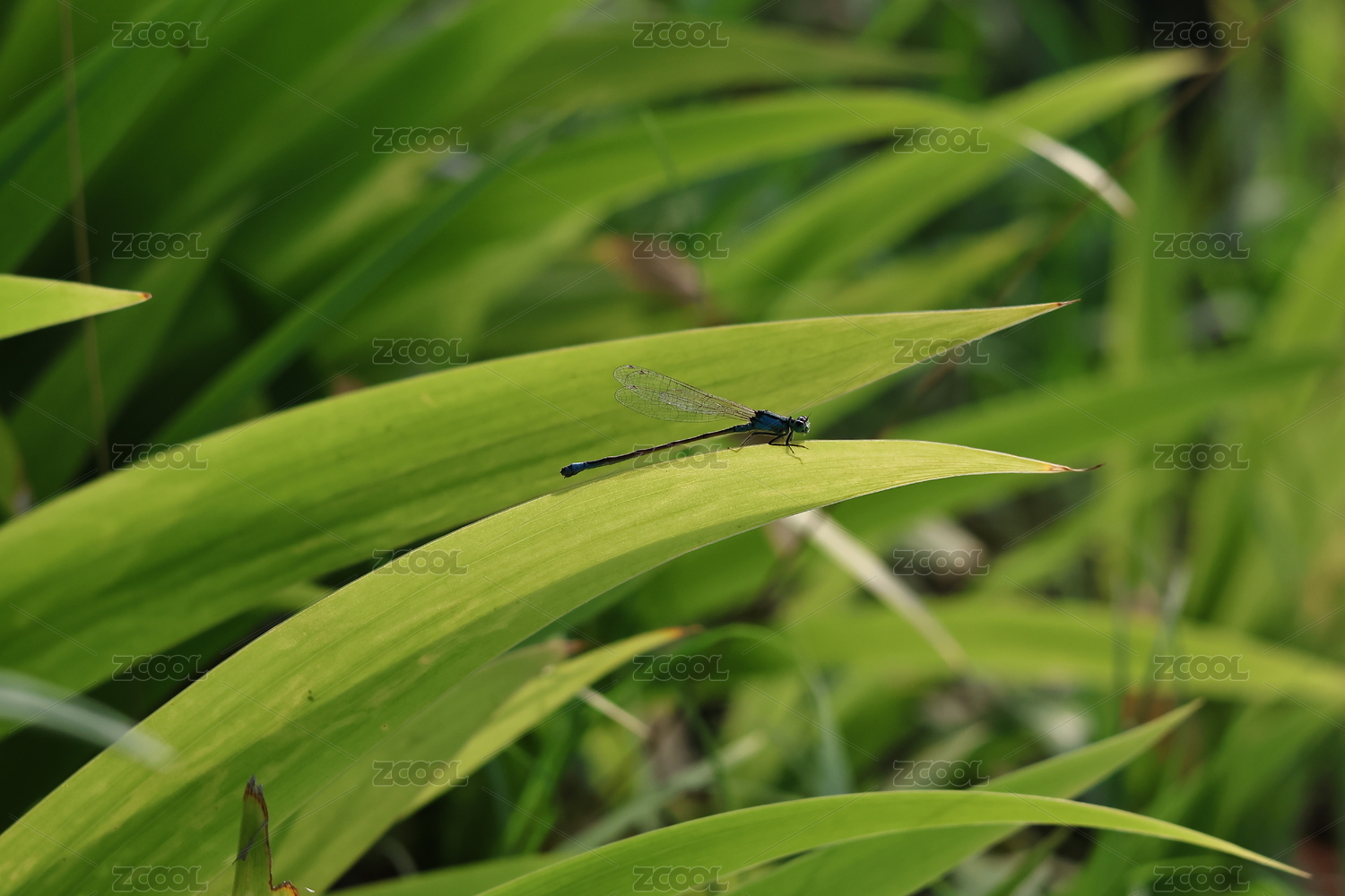 清晨停栖在绿色草叶上的豆娘