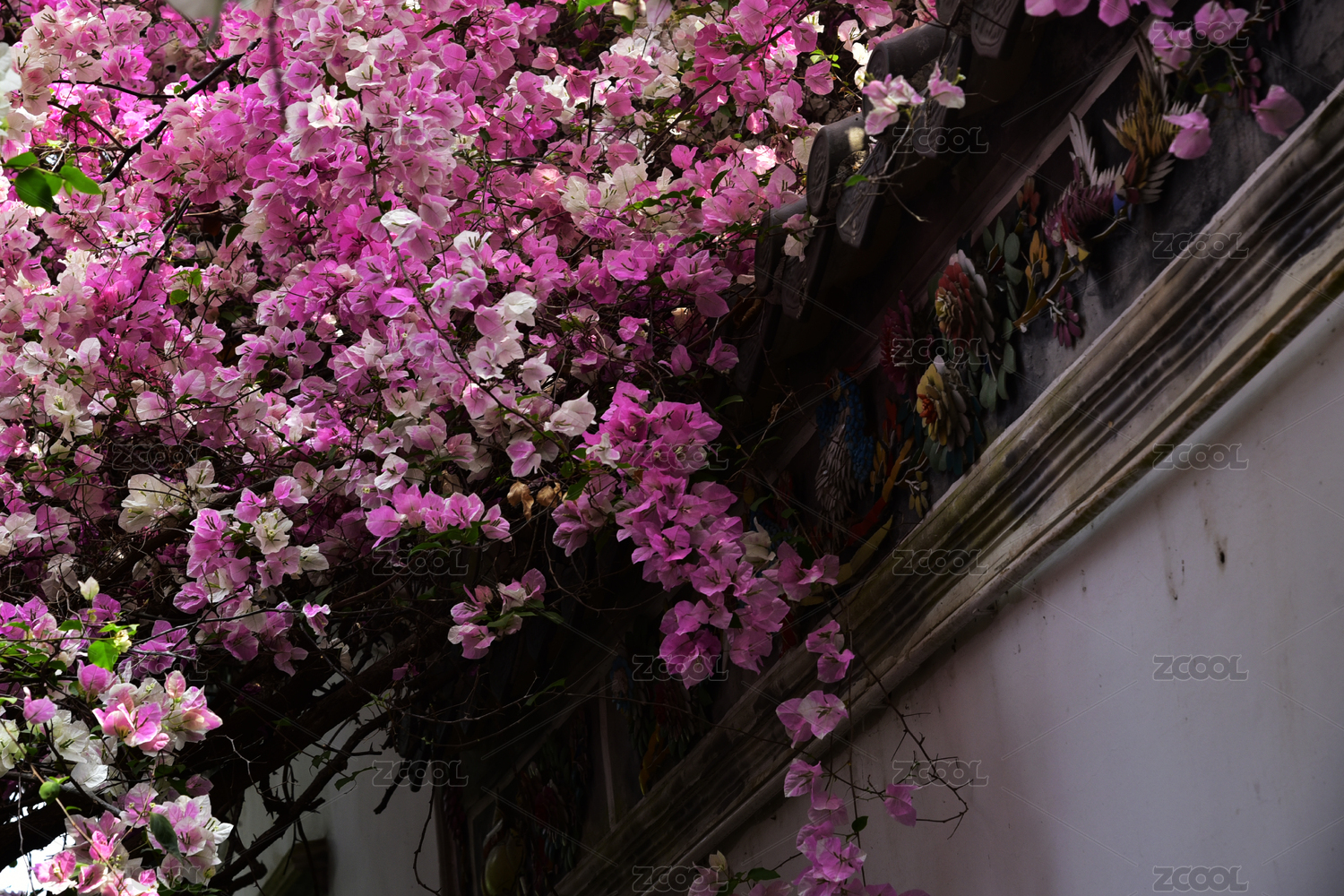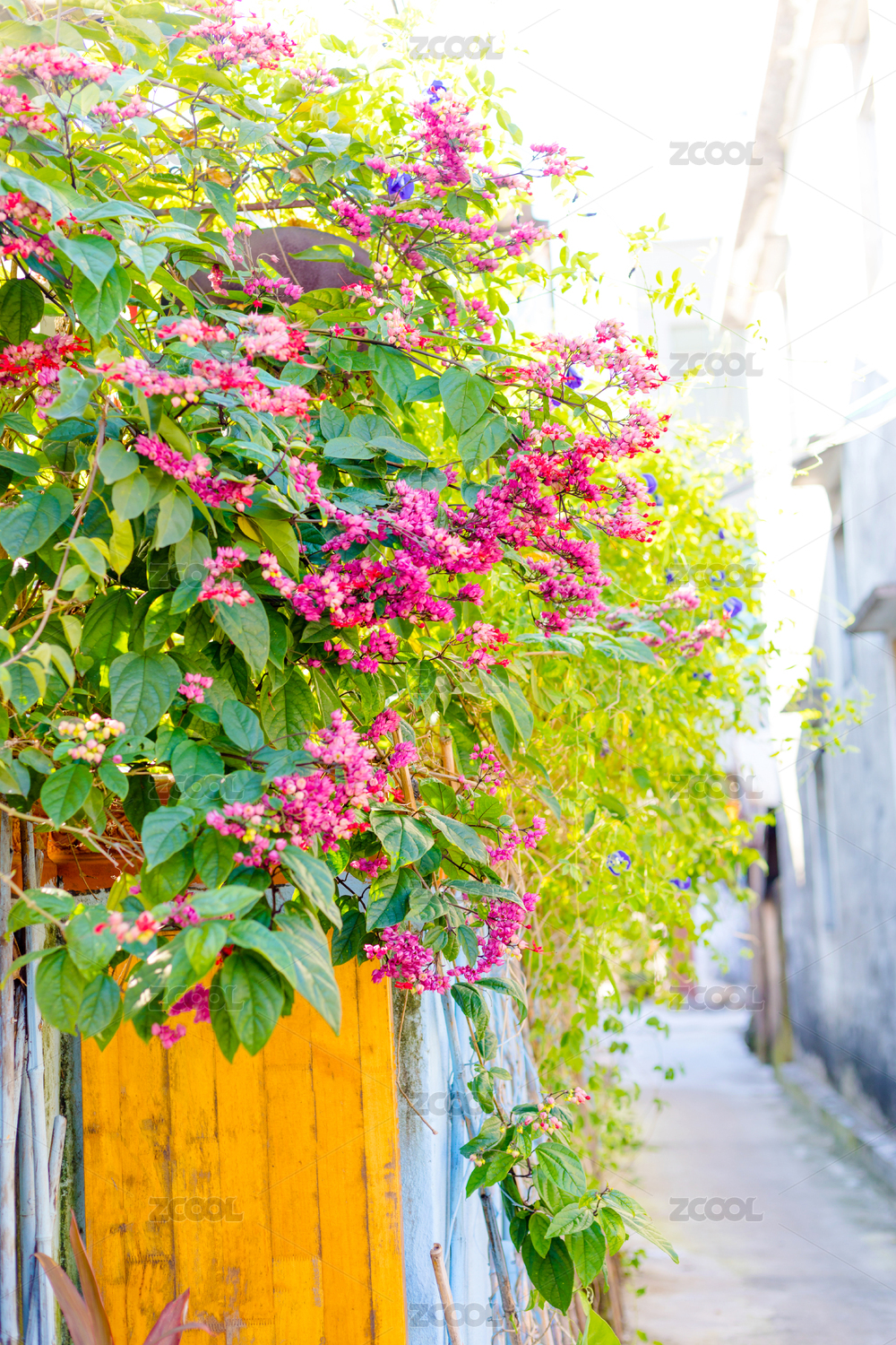 中国南方民居院子外灿烂开放的红萼龙吐珠