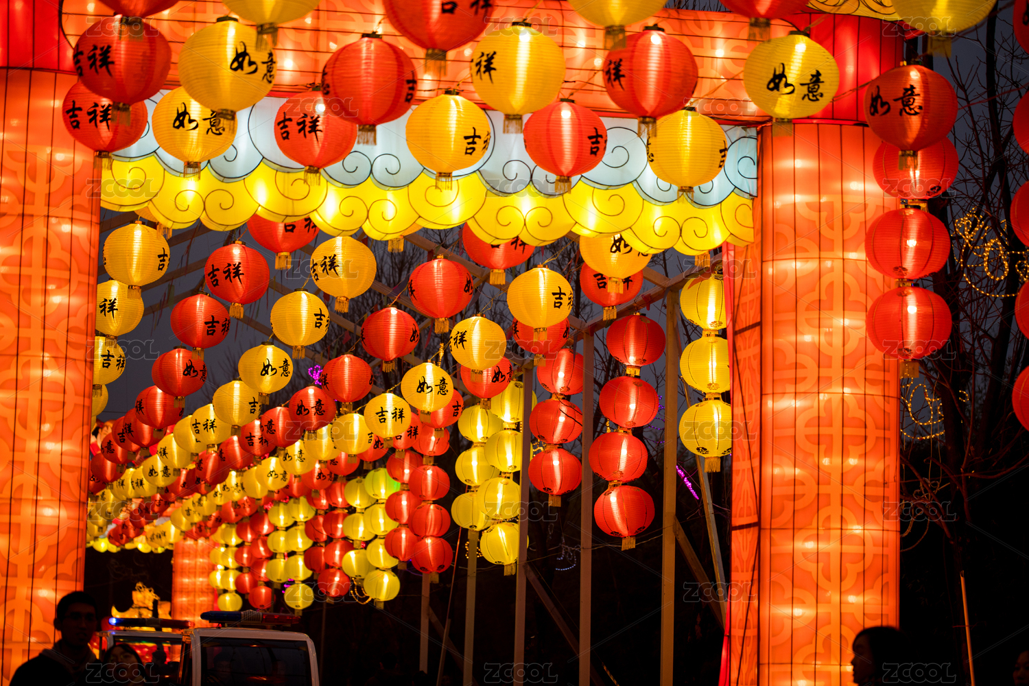 元宵灯会挂着的红色和金黄色灯笼组成的通道