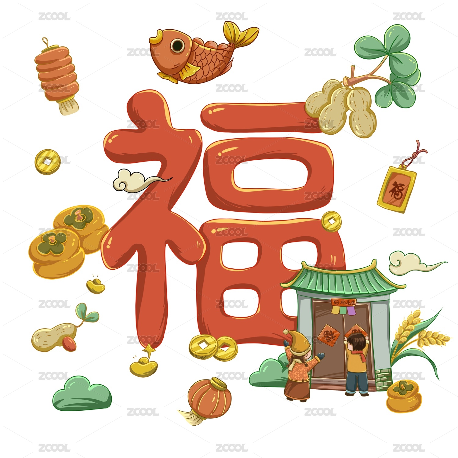 卡通人物小孩拿着毛笔书写福字中文汉字