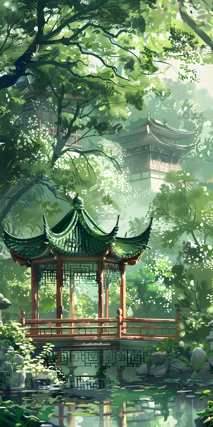 插画,古风,国风,意境,自然,水,树,叶子,植物,亭子
