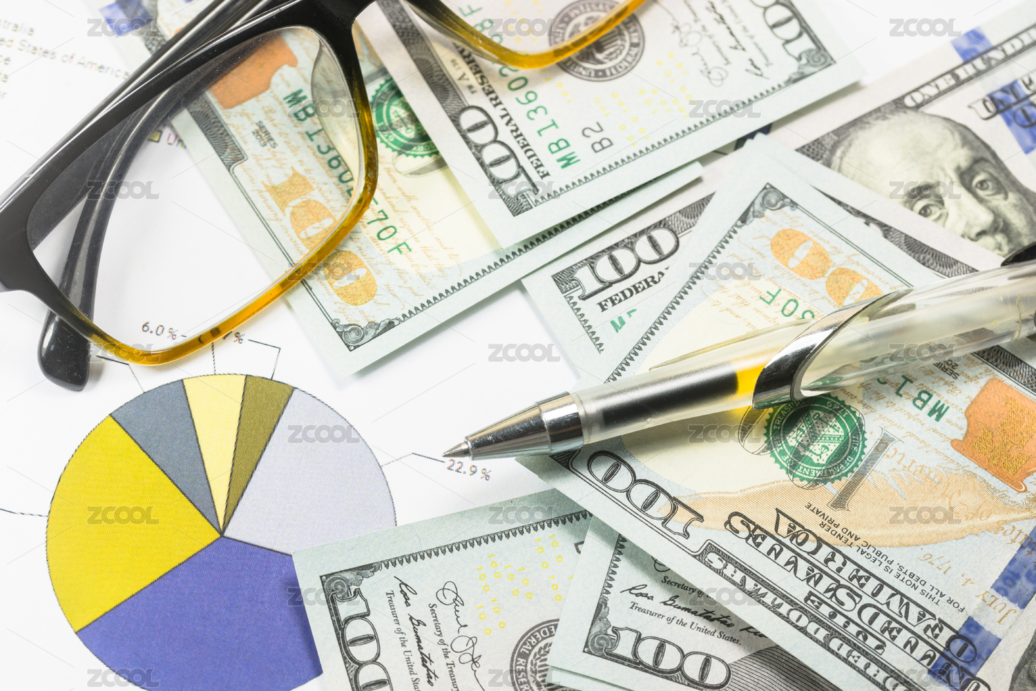美金钞票、笔、眼镜和商业图表摆放在办公桌上