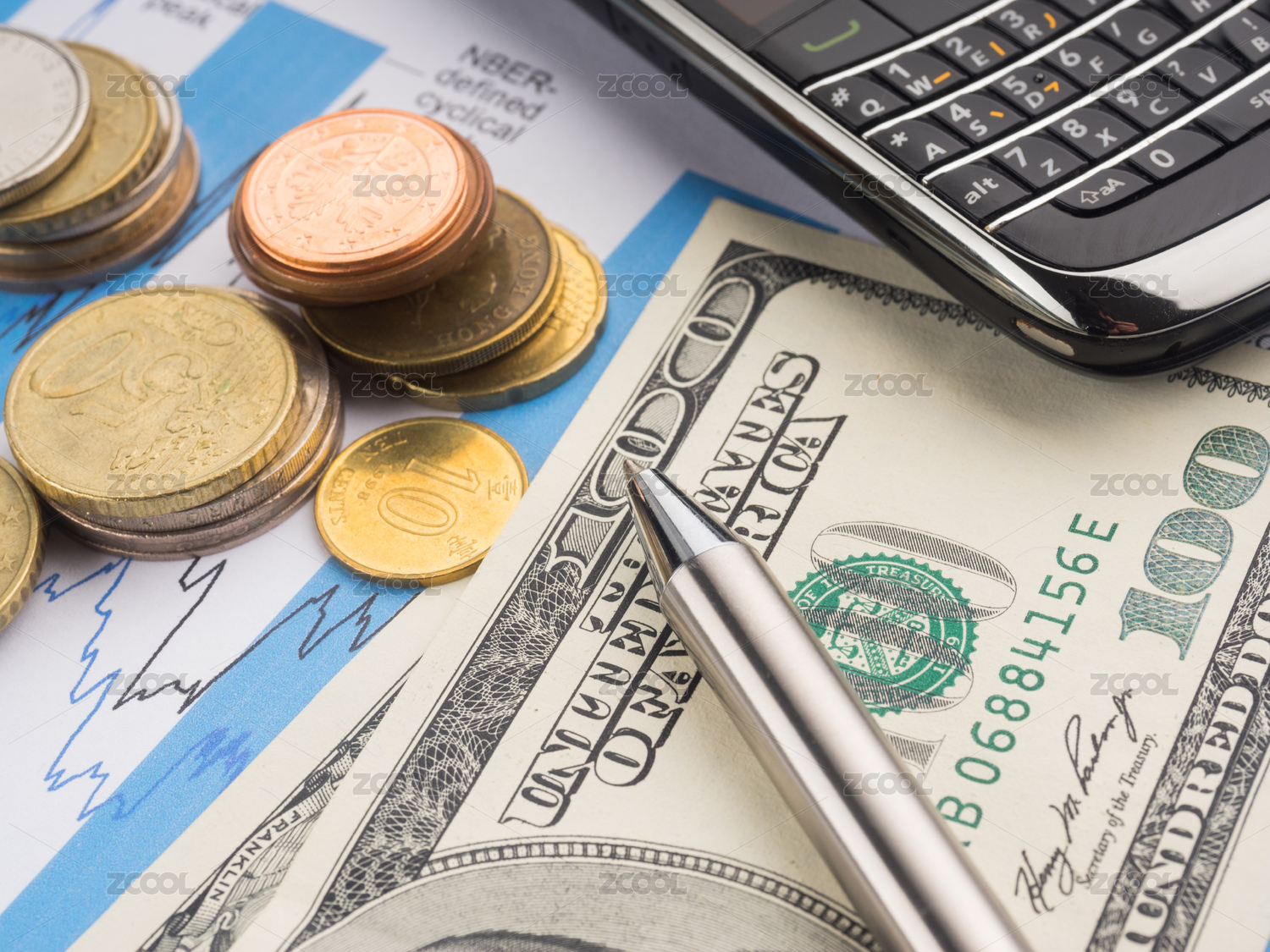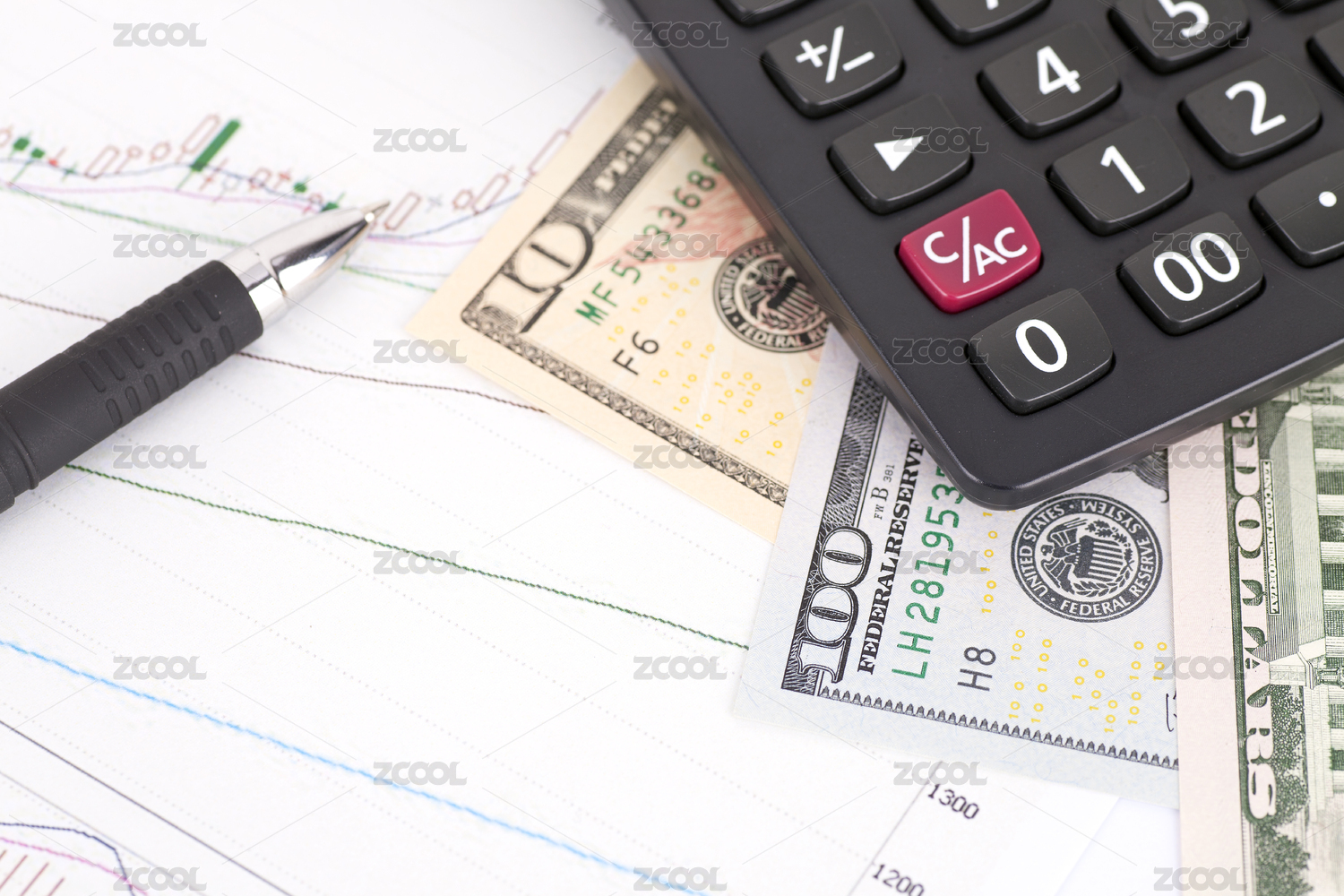 计算器、美金、美元钞票、商业图表、笔