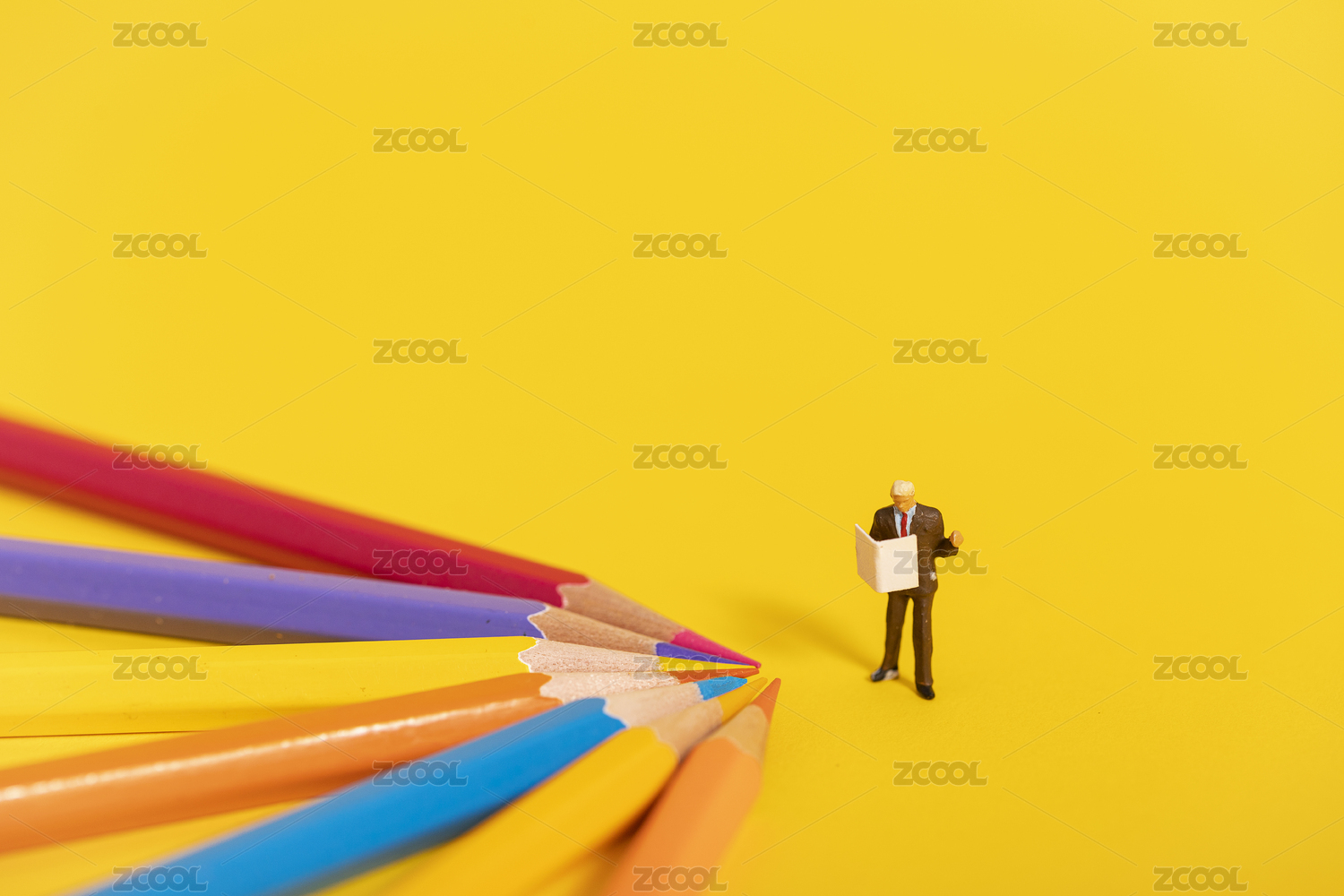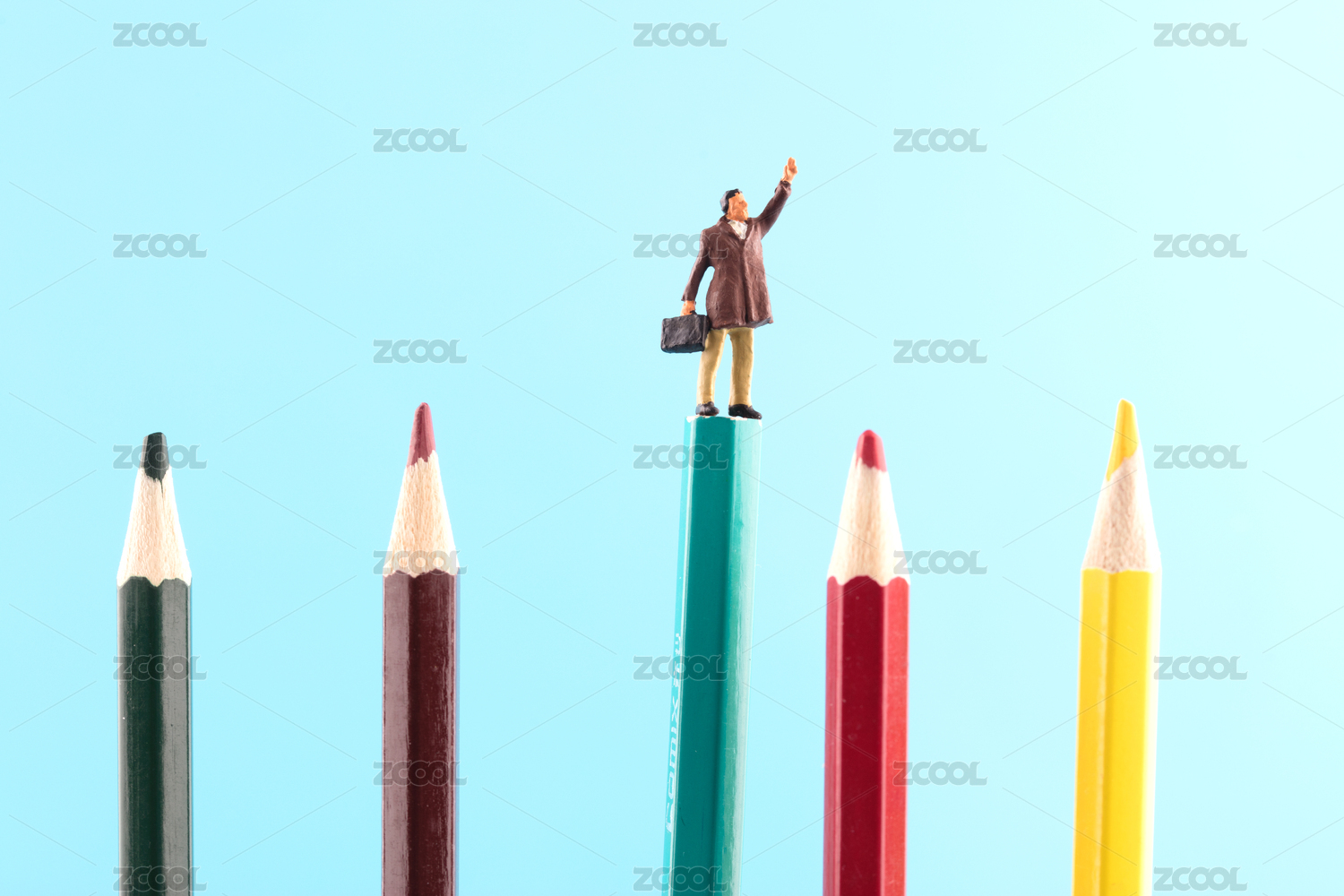 商人人偶站在彩铅笔顶端