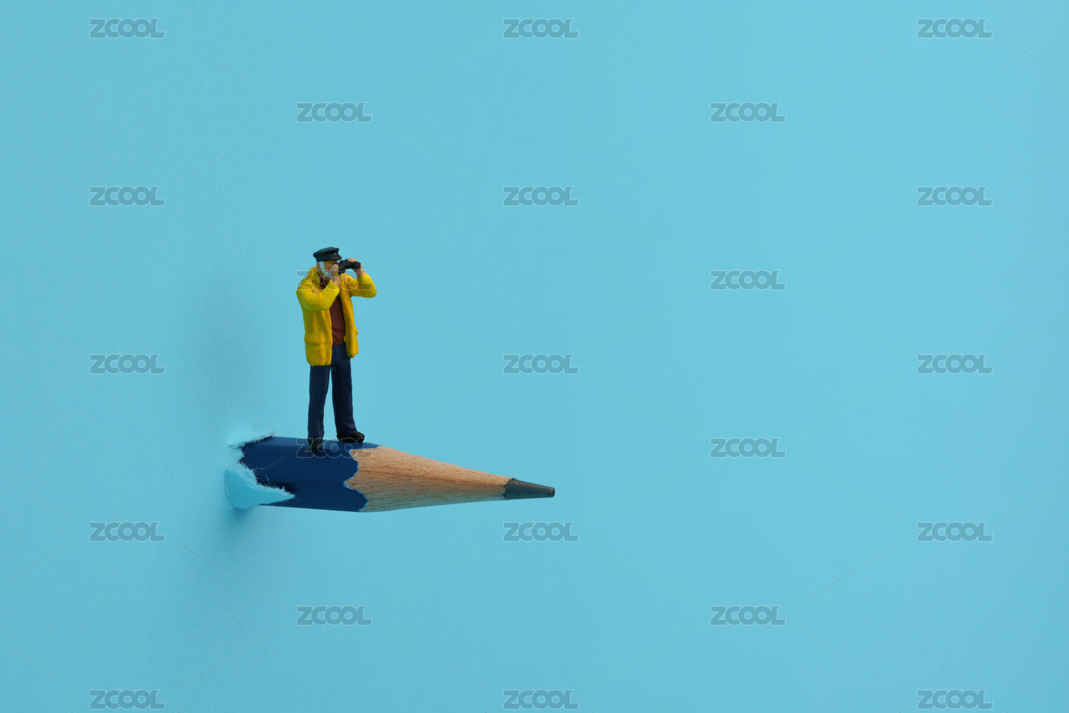 站在积木上观望远处的黄色铅笔微缩创意图