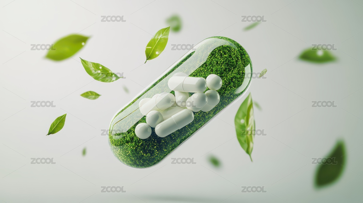 绿色胶囊与飘落绿叶的动态组合