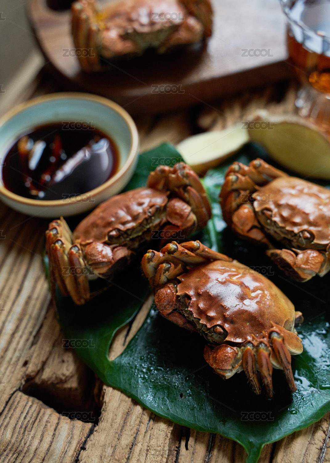 木纹背景上摆放熟的阳澄湖大闸蟹