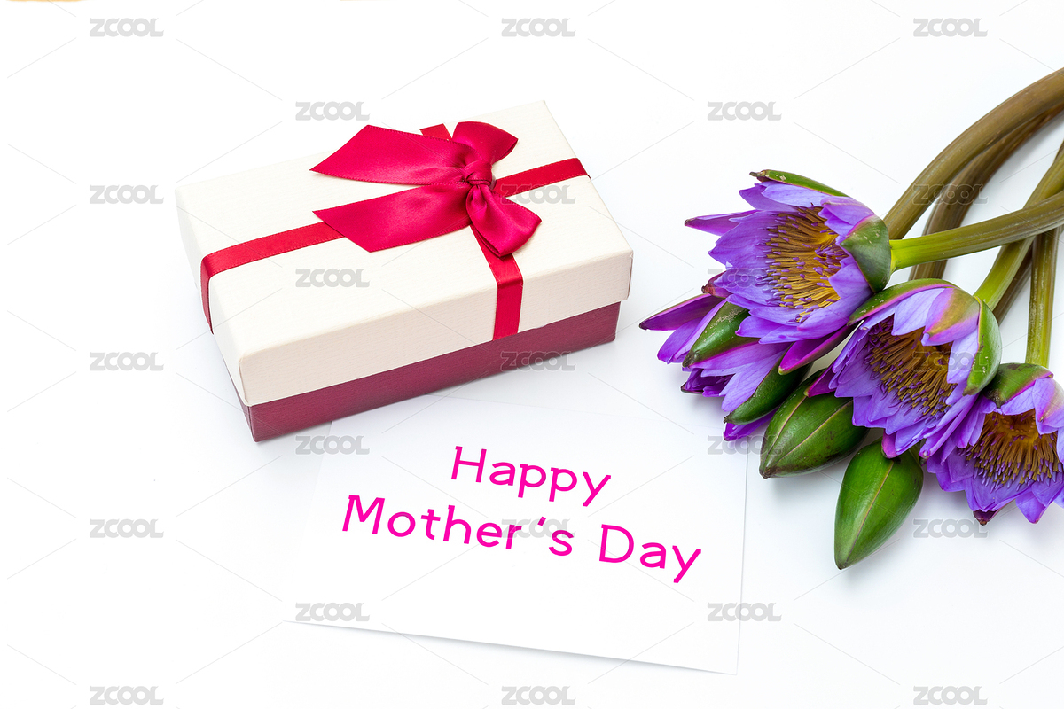 白色背景上的睡莲、礼物盒和母亲节贺卡