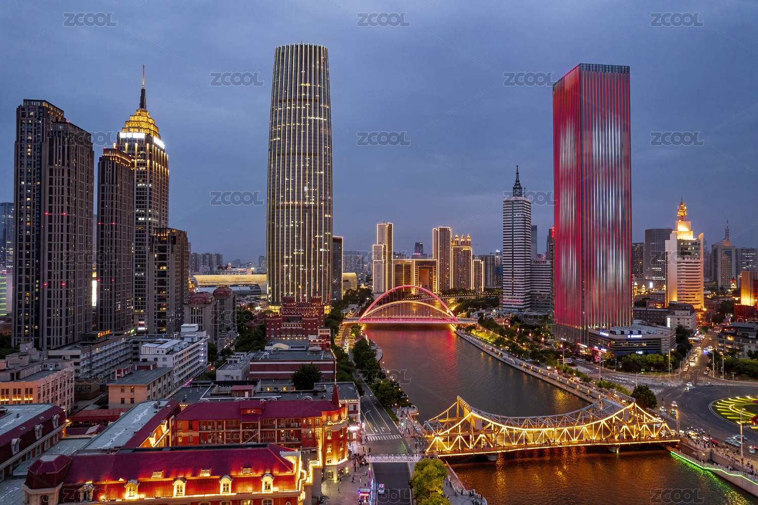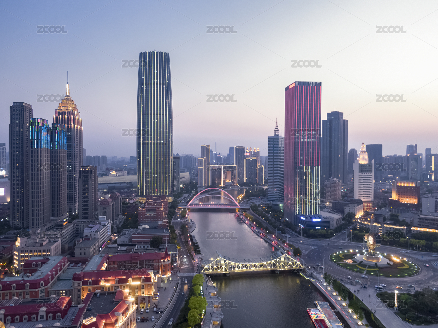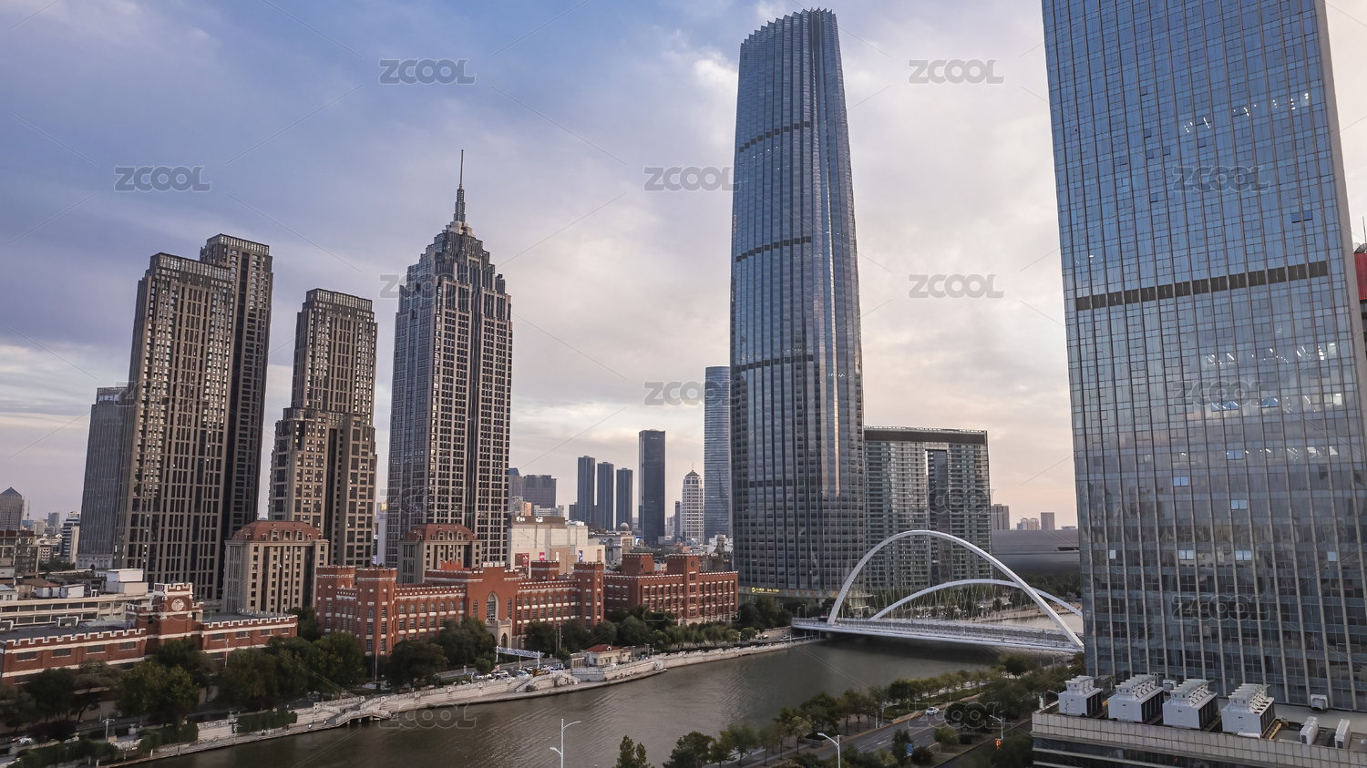 中国天津海河津湾环球金融中心日落城市风光