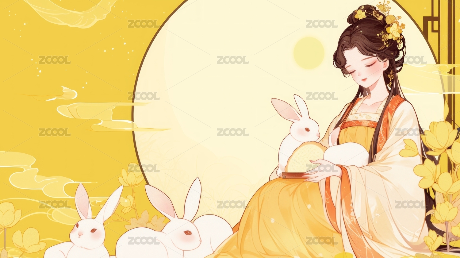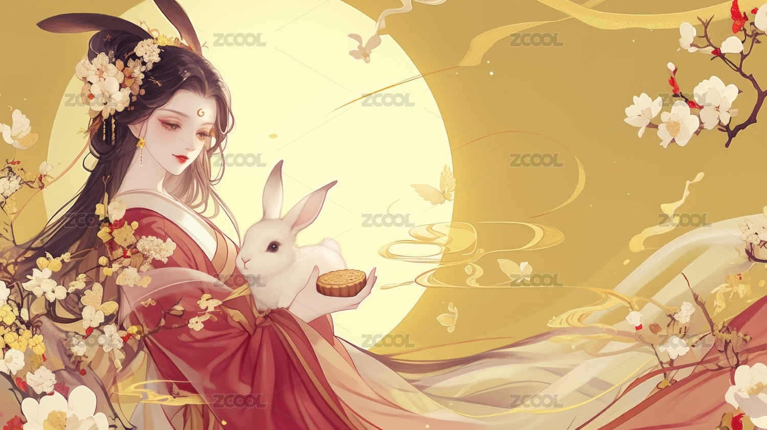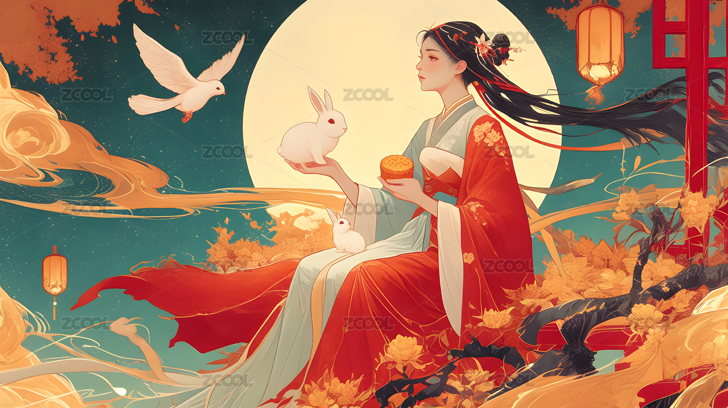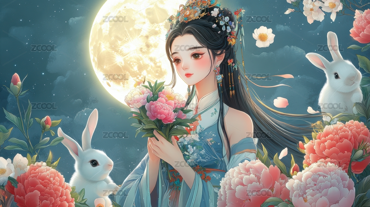 中秋节怀抱着月兔的满月下的嫦娥