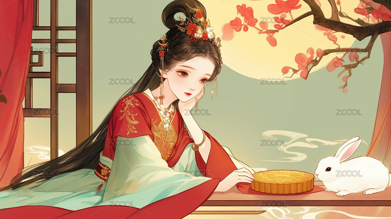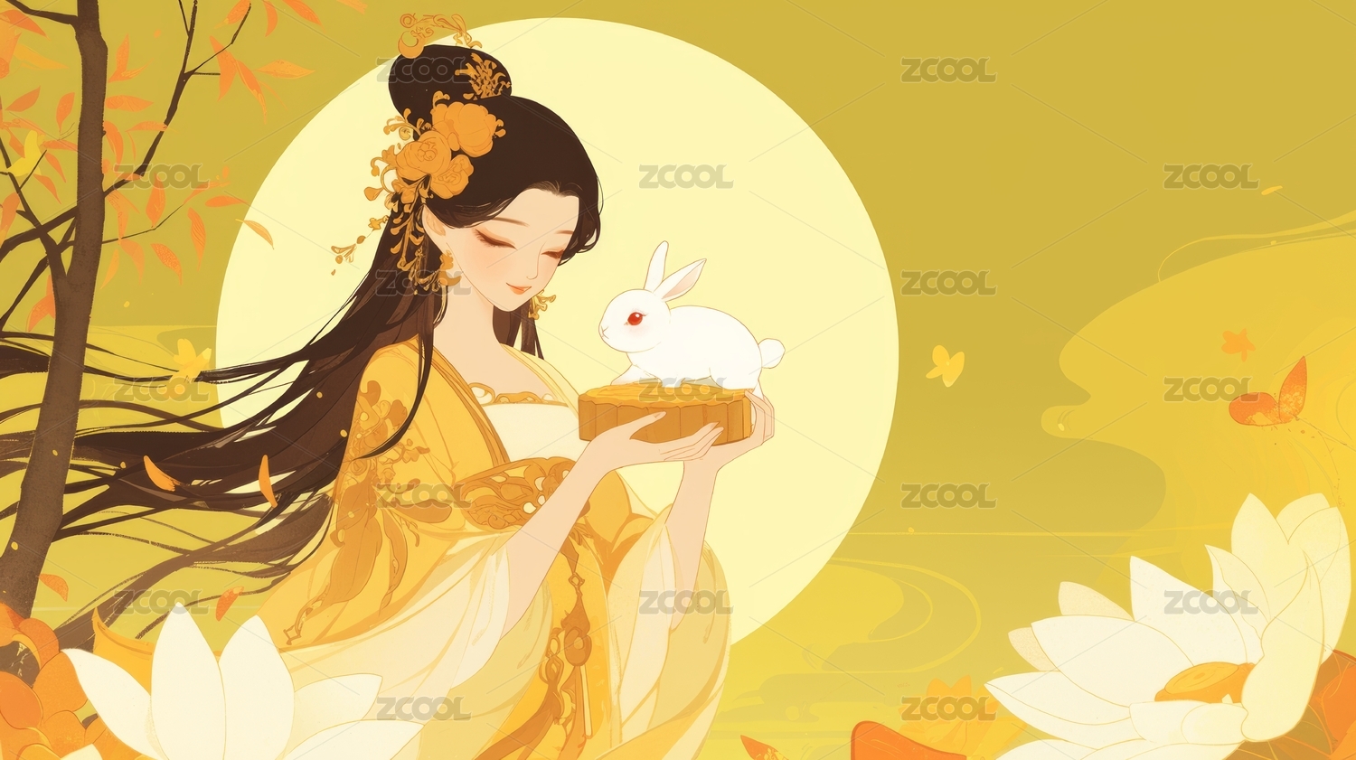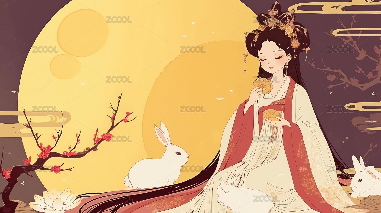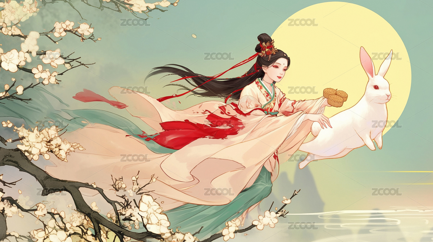 中秋节怀抱着月兔的满月下的嫦娥