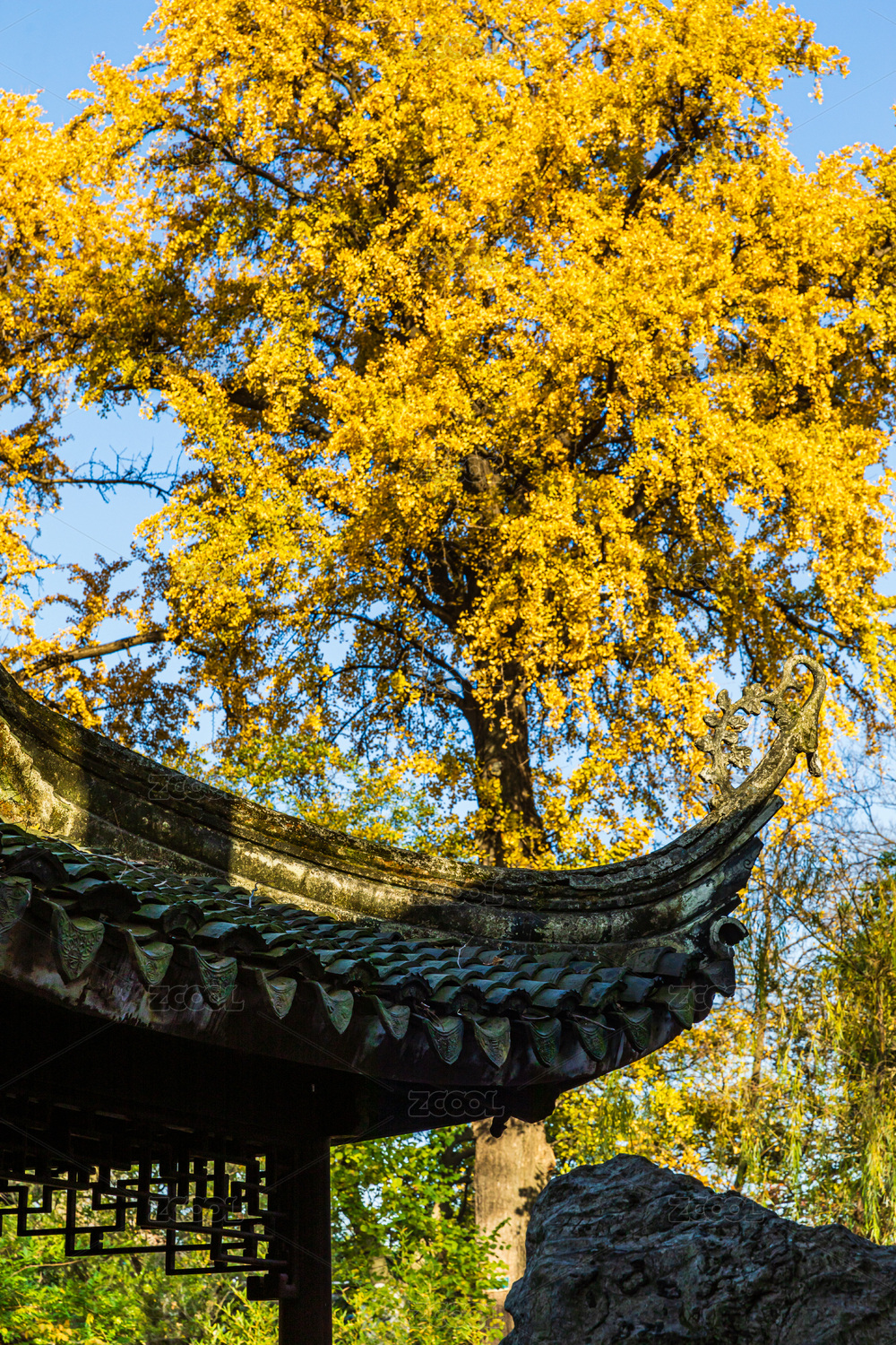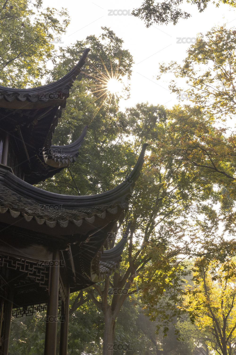 江南园林拙政园亭台楼阁 阳光穿透树叶