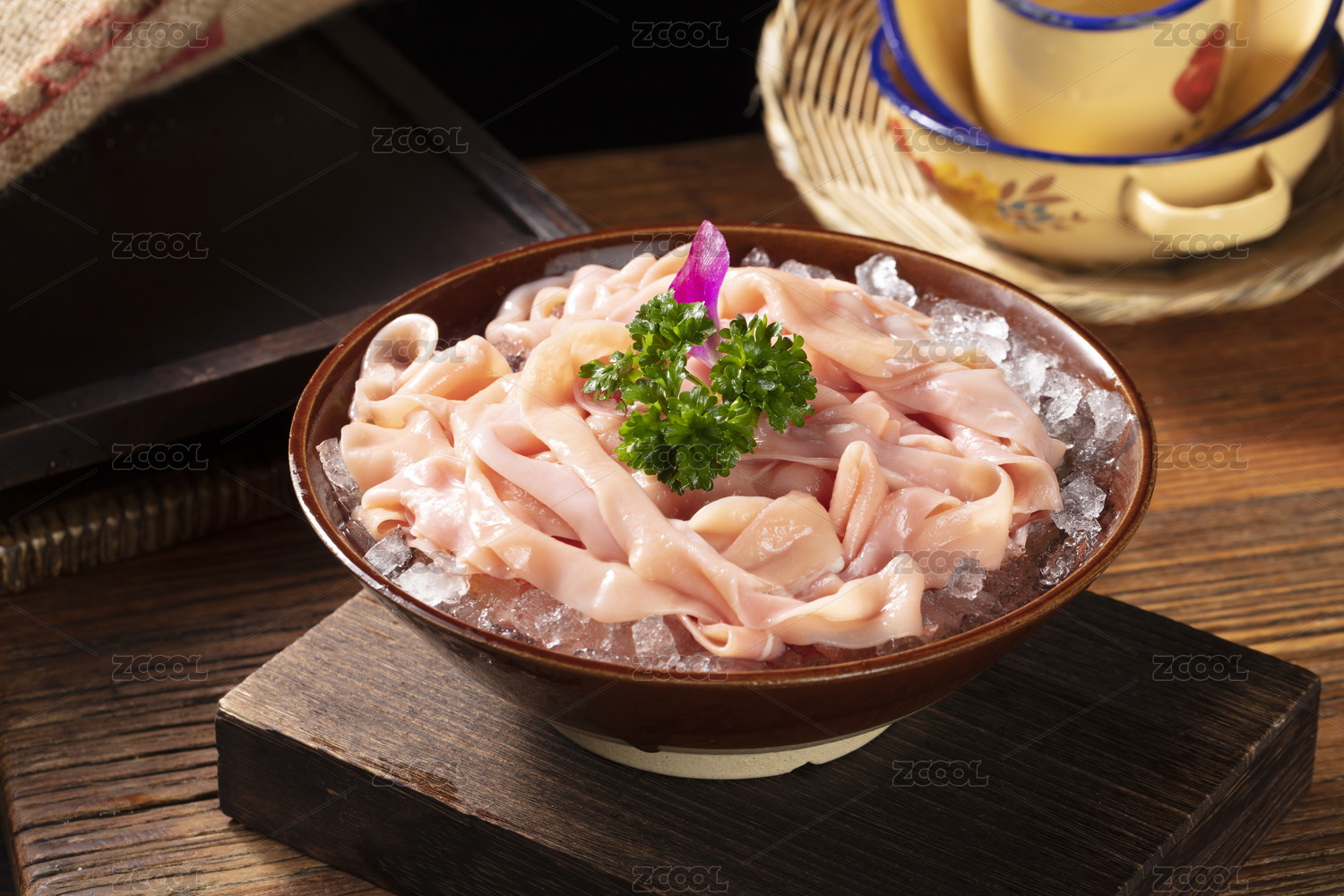 桌上盘里的重庆老火锅菜品冰鲜鸭肠鹅肠