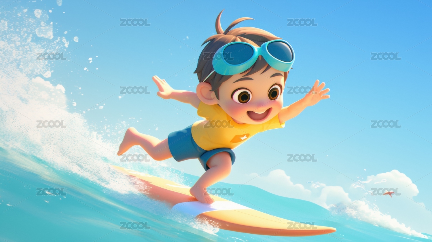 夏季多巴胺配色3D卡通的美女在海边嬉水