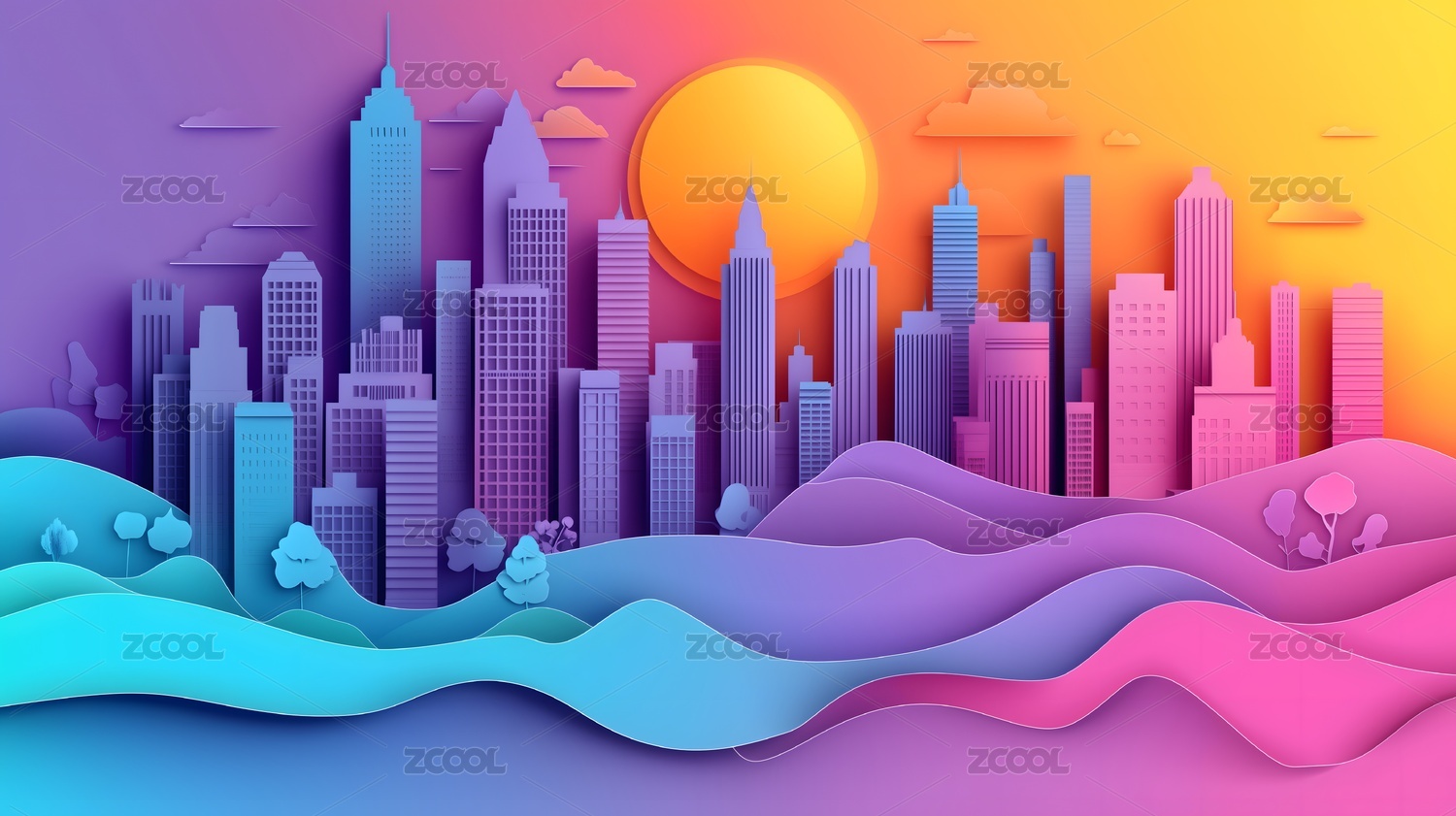 纸艺风格城市剪影与日落