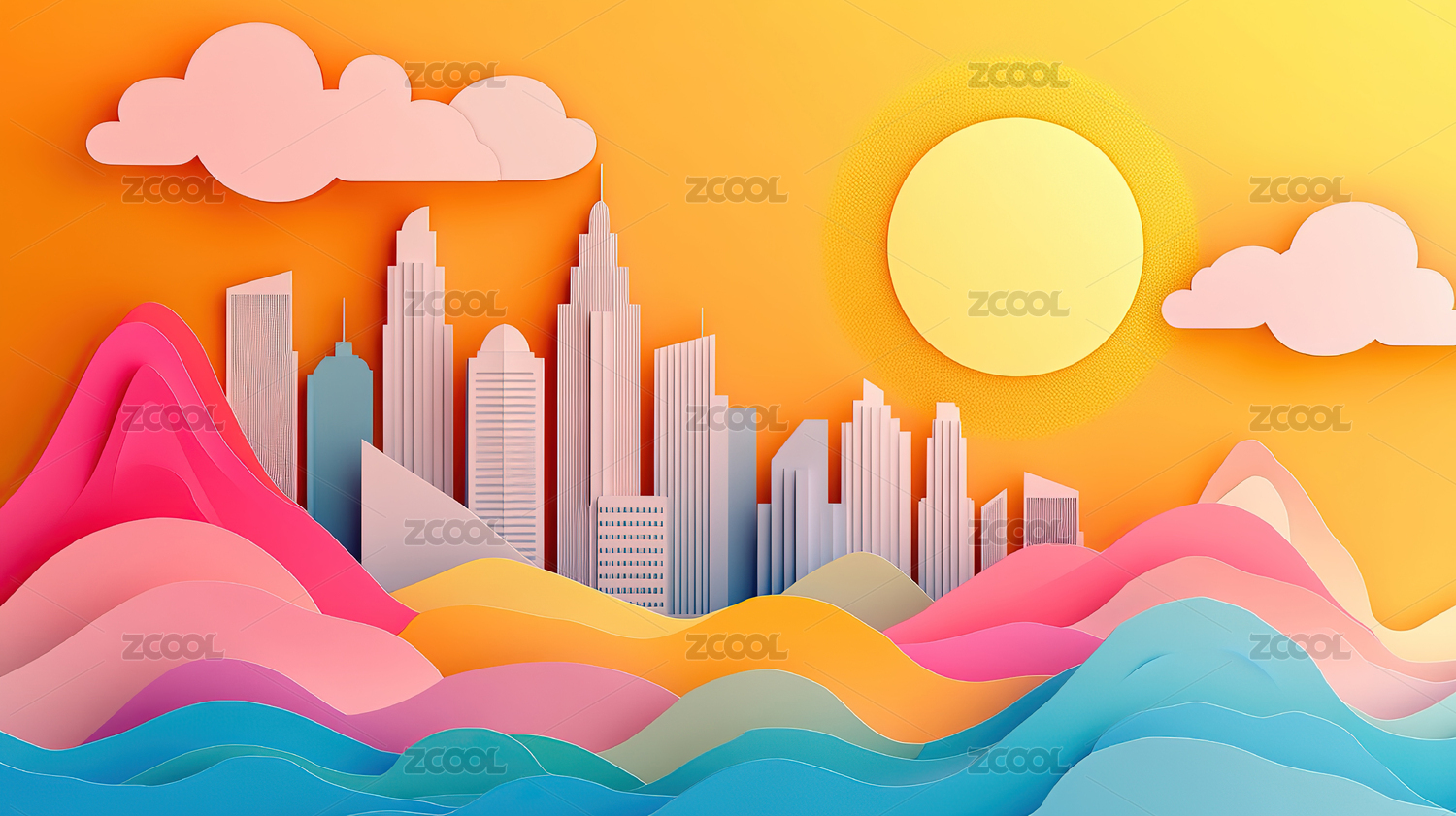 彩色山峦与城市剪影