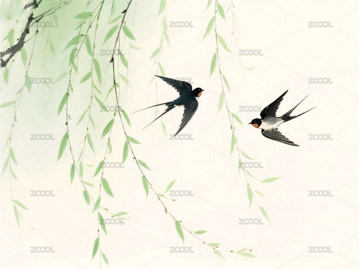 水墨燕子与垂柳