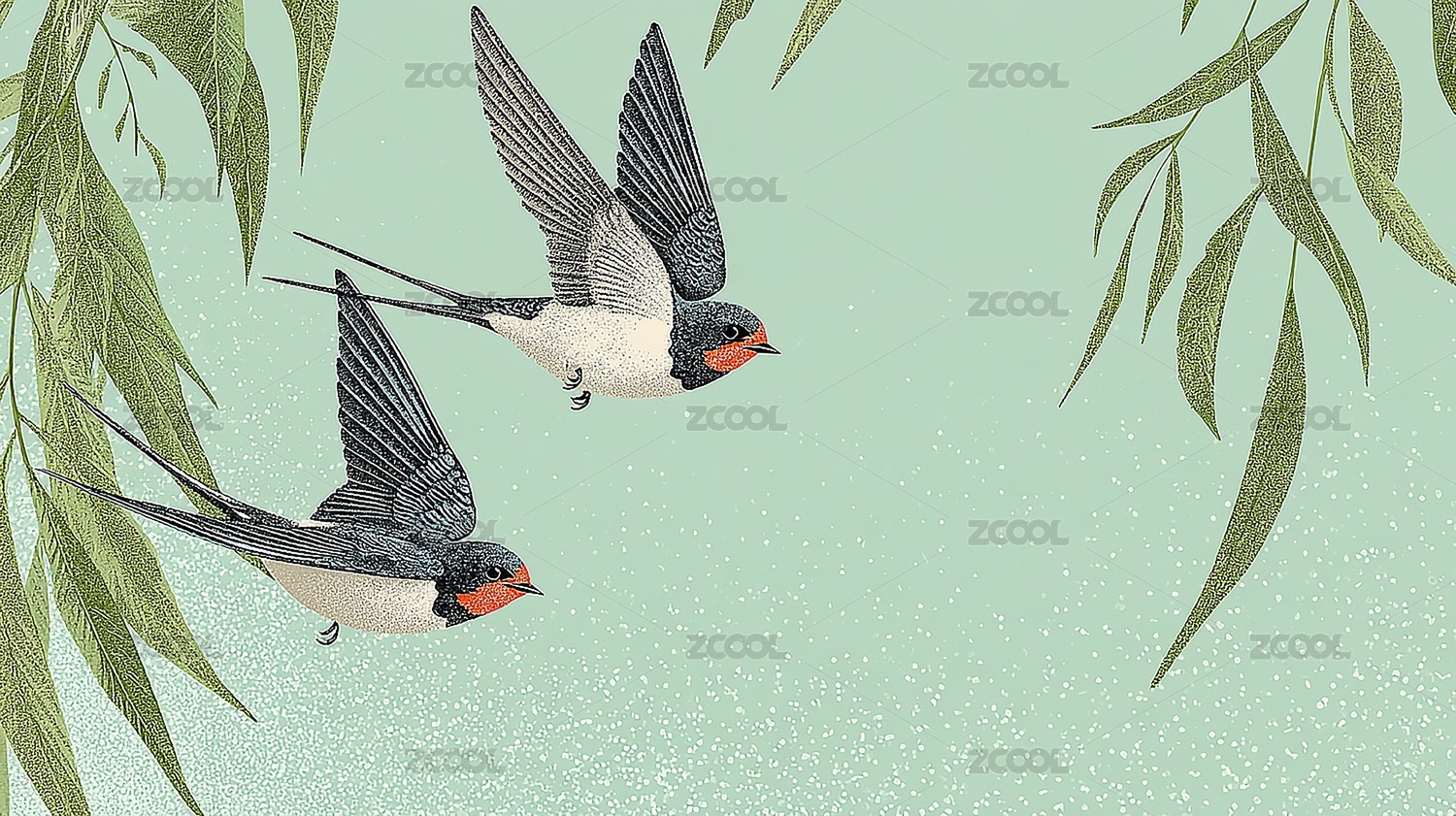 绿色柳树燕子飞翔插画