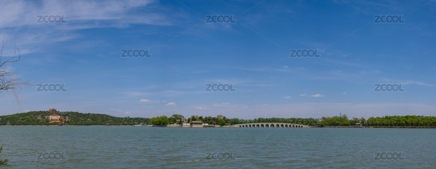 春季颐和园佛香阁南湖岛十七孔桥全景
