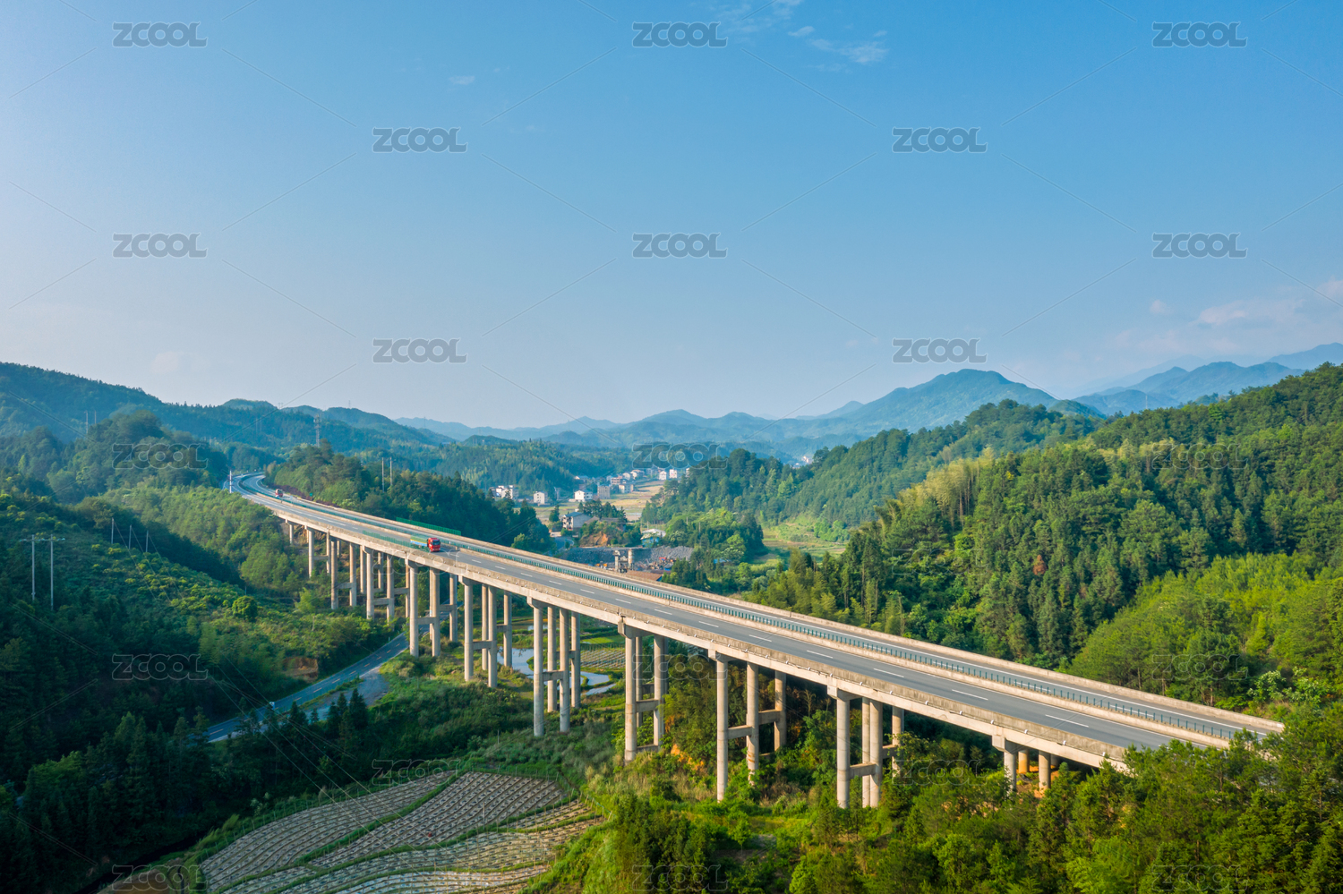 蓝天白云阳光下桂林高山下河流旁的高速公路
