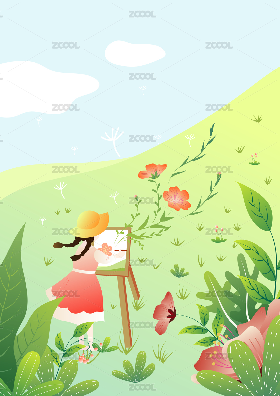 春天草地上画画的女孩