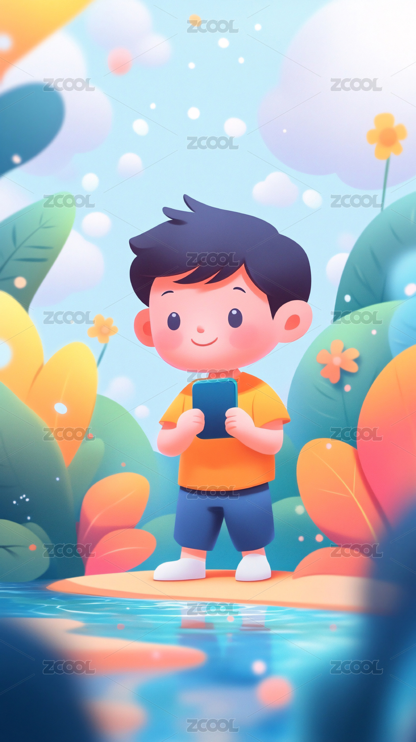 儿童节小孩玩手机童年休闲娱乐生活场景插画