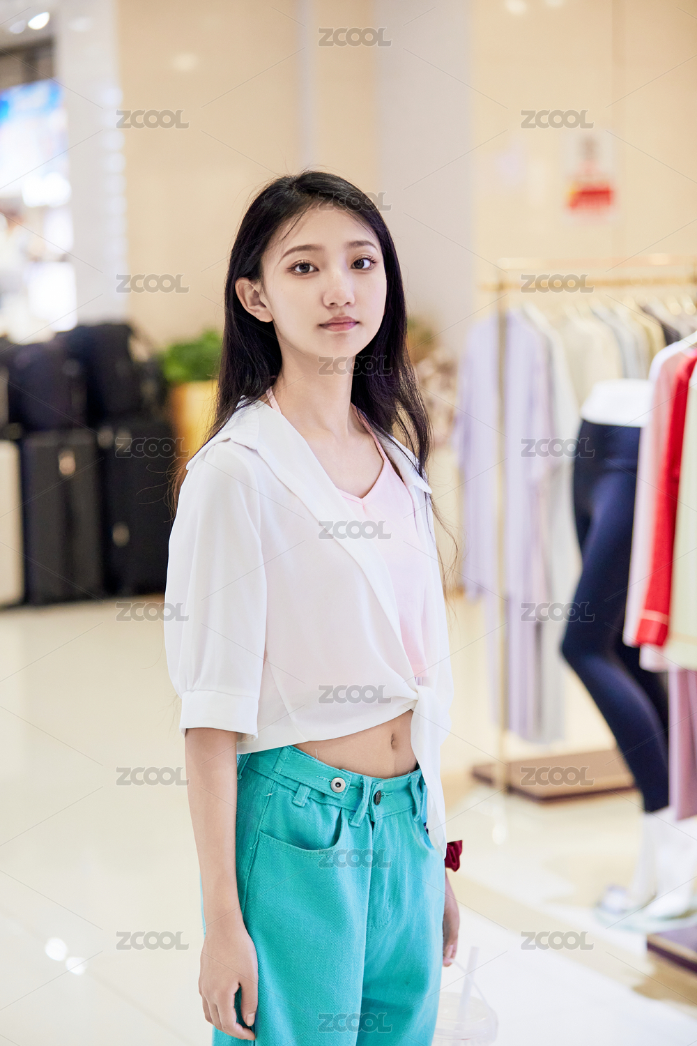 假日悠闲逛商场服装区的中国少女