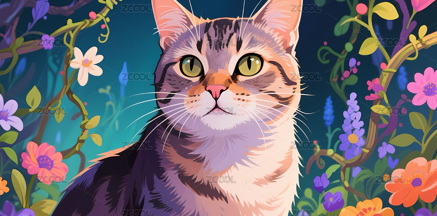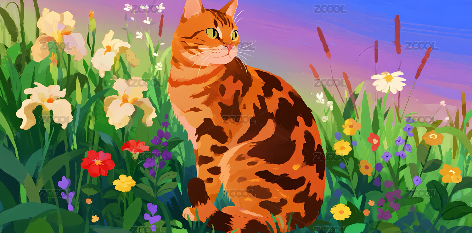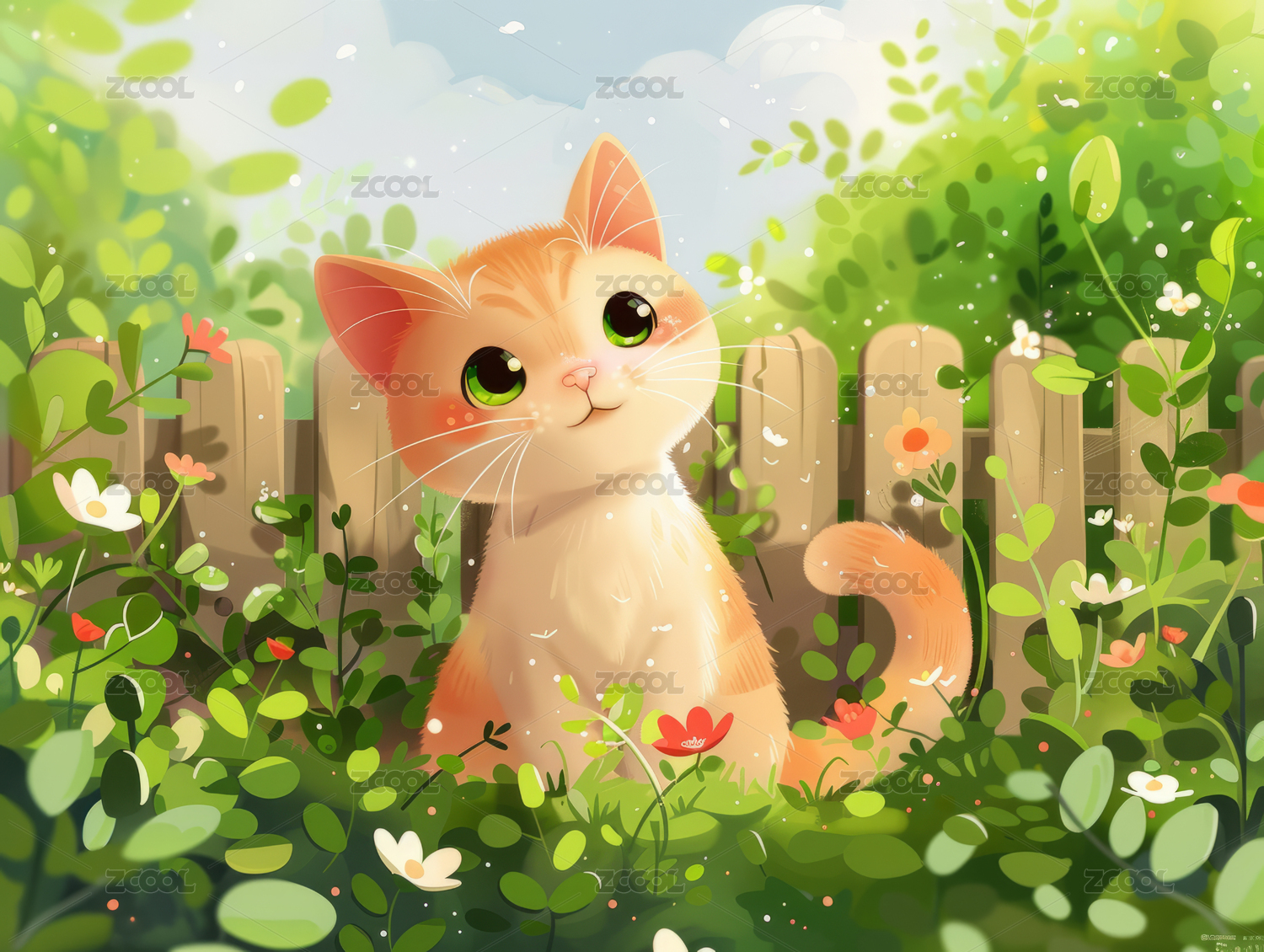 手绘,卡通,夏日,草地,天空,猫,插画,动物,宠物,可爱