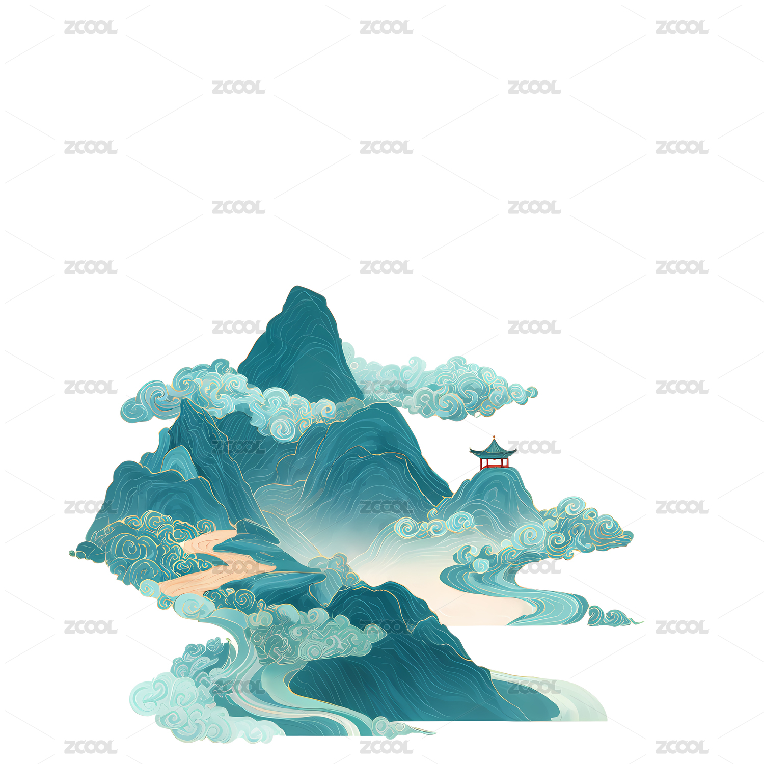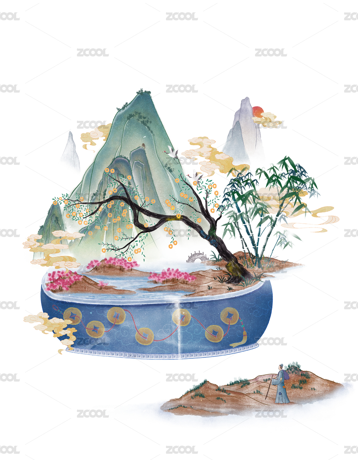 中国古风水墨微观山水场景女孩满载一船鲜花