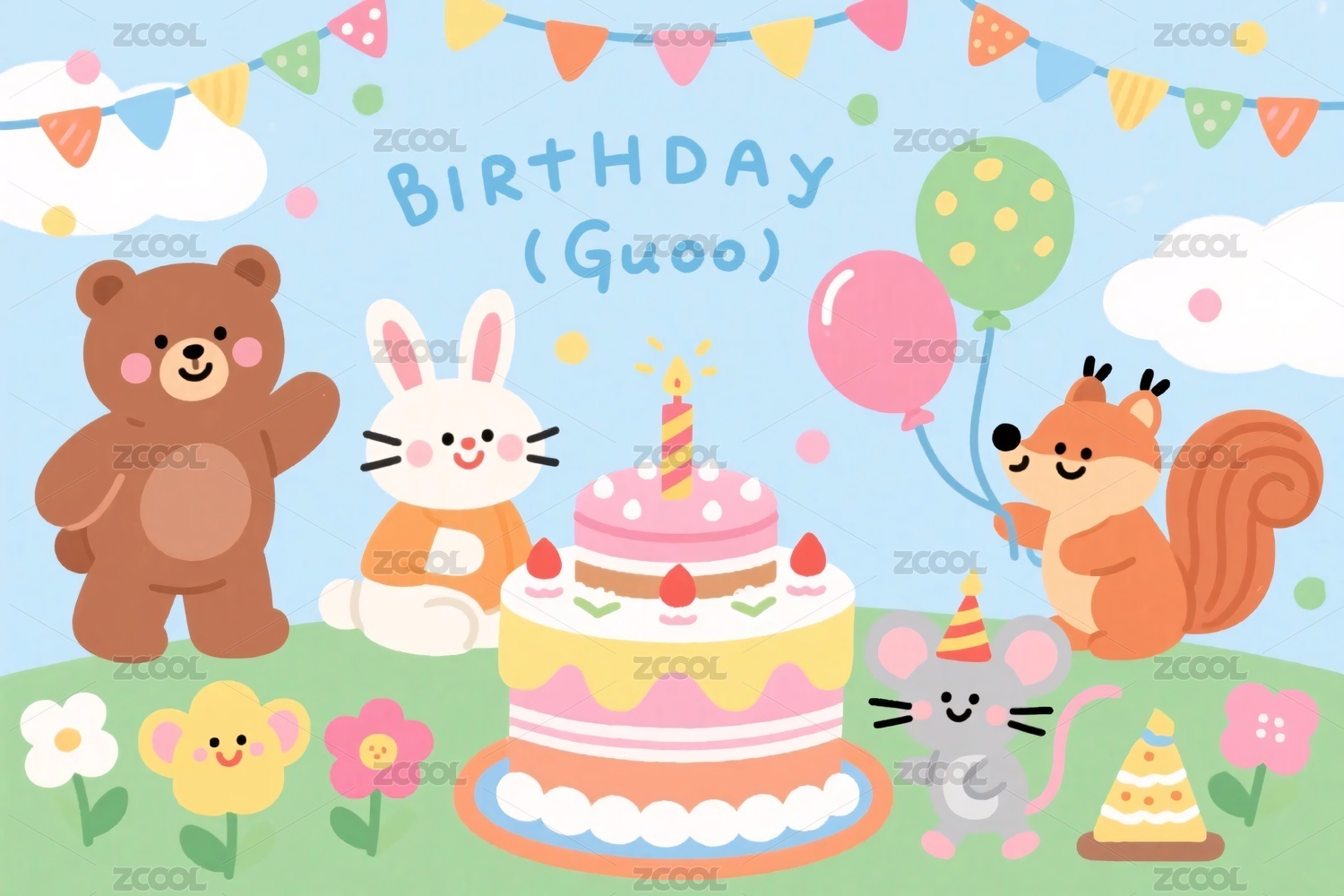 蛋糕,糕点,甜品,甜点,祝贺图,彩带,彩旗,彩条,小动物,动物